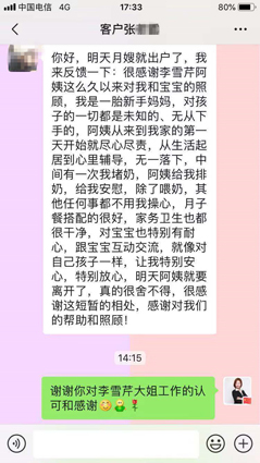 明天月嫂就出戶了,很感謝李雪芹阿姨這么久以來對我和寶寶的照顧,我是一胎新手媽媽,對孩子的一切都是未知的、無從下手的,阿姨從來到我家的第一天開始就盡心盡責,從生活起居到心里輔導,無一落下,中間有一次我堵奶,阿姨給我排奶,給我安慰,除了喂奶,其他任何事都不用我操心,月子餐搭配的很好,家務衛生也都很干凈,對寶寶也特別有耐心,跟寶寶互動交流,就像對自己孩子一樣,讓我特別安心,特別放心,明天阿姨就要離開了,真的很舍不得,很感謝這短暫的相處,感謝對我們的幫助和照顧!