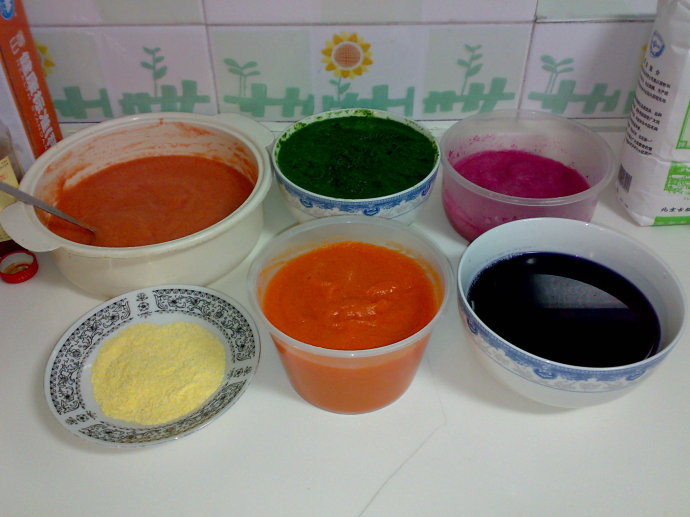綠色-菠菜汁:菠菜小半斤,清洗后,用開水快速焯一下水去澀味,然后瀝水后打漿(勿加水)
