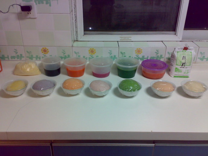 每種顏色取一小碗餃子粉就夠了,把以上6中顏色原料和進面里,加上白色面素,七彩的面團兒就算是備好了,和好的面最好能醒一晚上,這樣包的餃子,皮兒非常勁道。