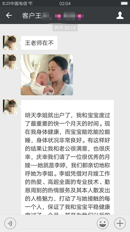每次的感謝都來自于客戶的認可和信賴,燕子月嫂阿姨們用自己的愛和付出,得到了客戶的肯定。李婷姐姐在客戶家一心護理寶寶和產婦,獲得了客戶的高度評價,為李姐感到驕傲。燕子月嫂會繼續努力培養出更多的優秀月嫂,為新爸爸媽媽保駕護航,幫助新媽媽做一個舒適安心的好月子,幫助寶寶度過人生中最重要的第一個月!