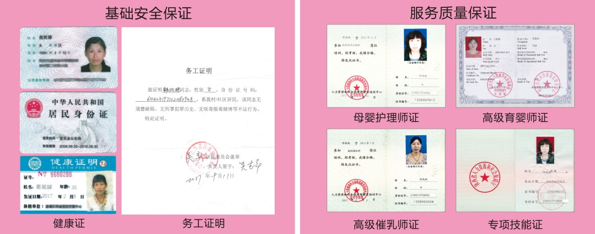 月嫂首先要請(qǐng):有身份證、健康證、打工證明;除了以上的基礎(chǔ)證書(shū)外,其次要看月嫂的上崗證:高級(jí)母嬰護(hù)理師,高級(jí)育嬰師,專(zhuān)項(xiàng)技能,高級(jí)催乳師證書(shū)。