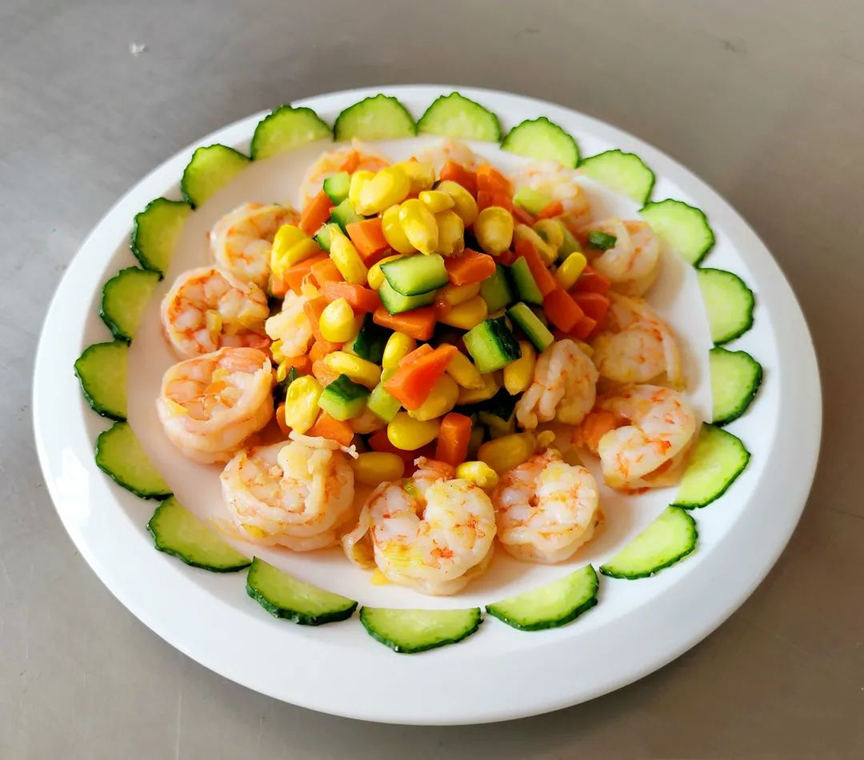 食材:玉米粒、黃瓜、胡蘿卜、蝦仁 。