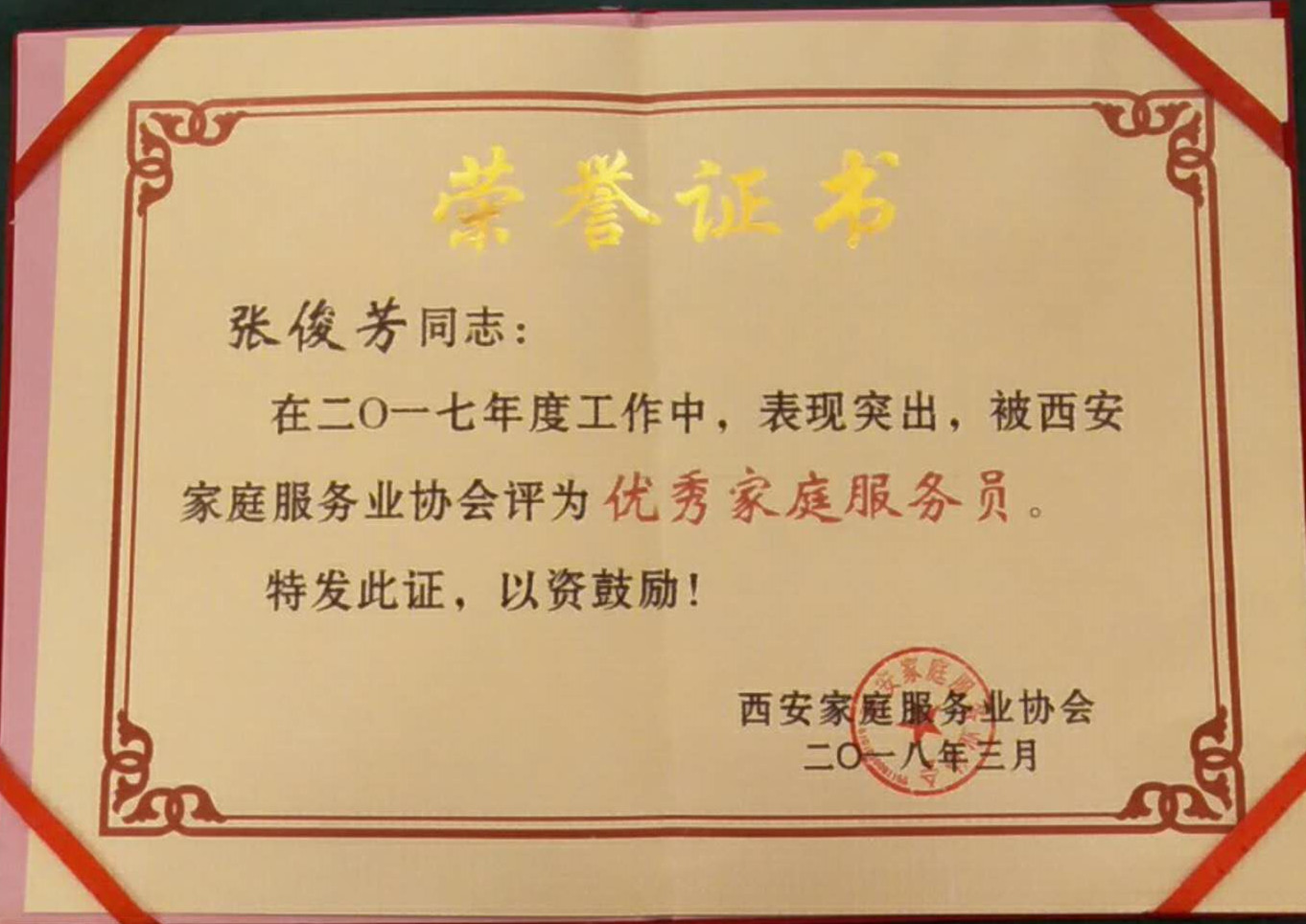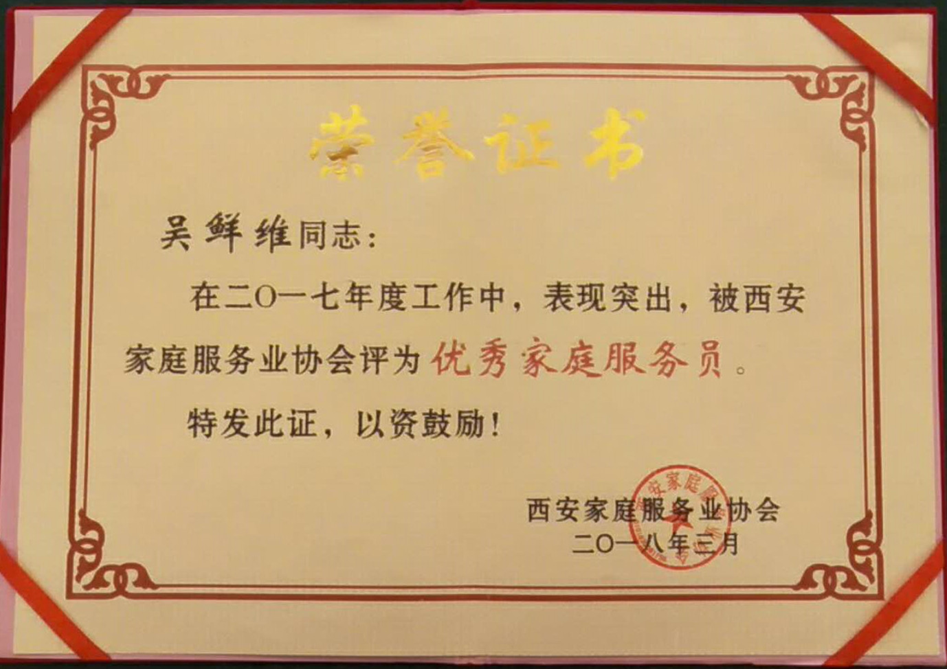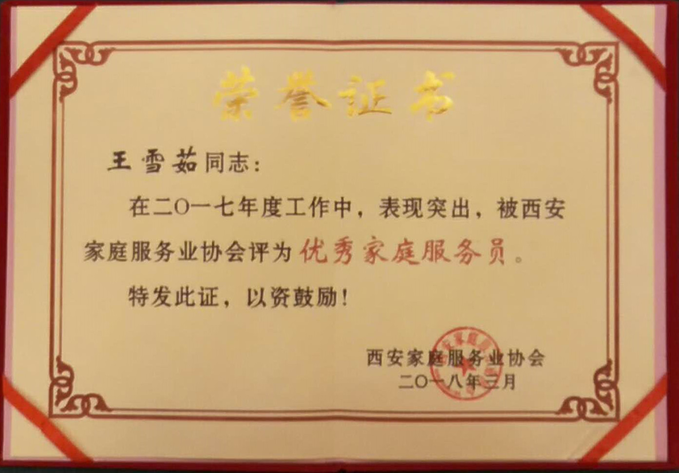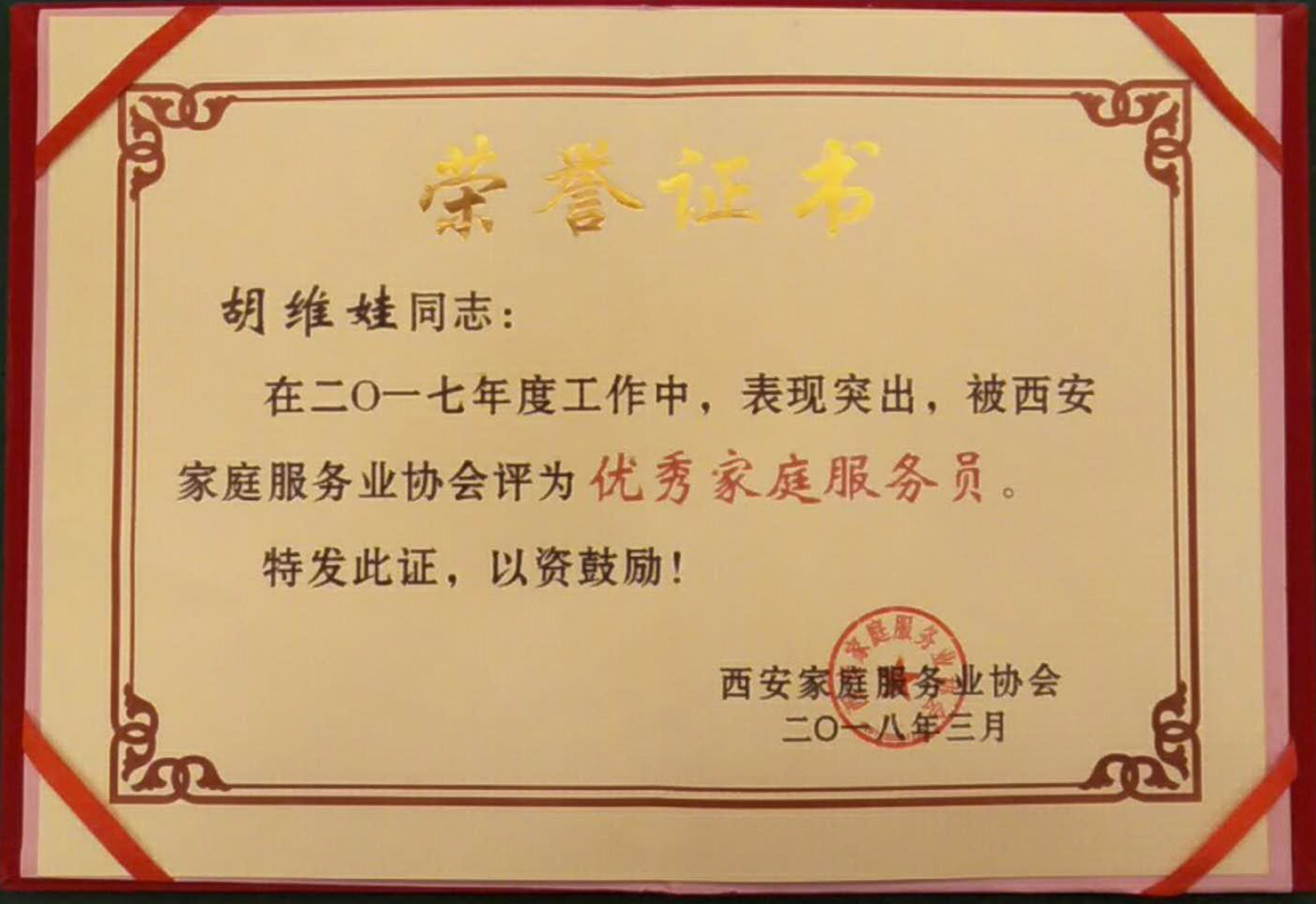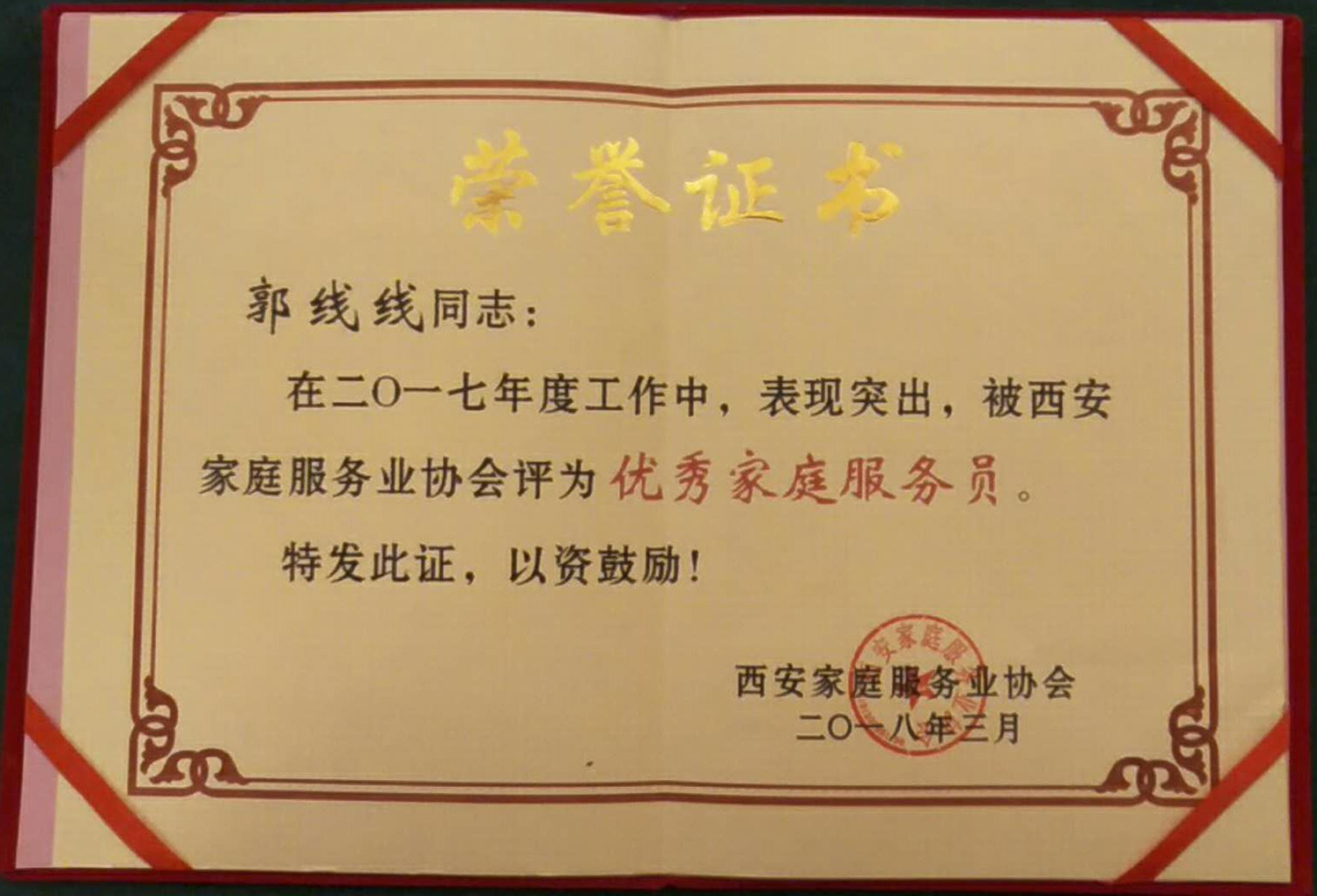 恭喜月嫂郭線線,張俊芳,呂學英,孫小利,周彩過,田曉艷,蘇曉群,吳鮮維,李答榮,黃文秀,王雪茹,高偉俠,劉菊鴿,朱盈盈,胡維娃眾姐妹,獲得西安市2017年家庭服務業(yè)協(xié)會優(yōu)秀家庭服務員稱號。