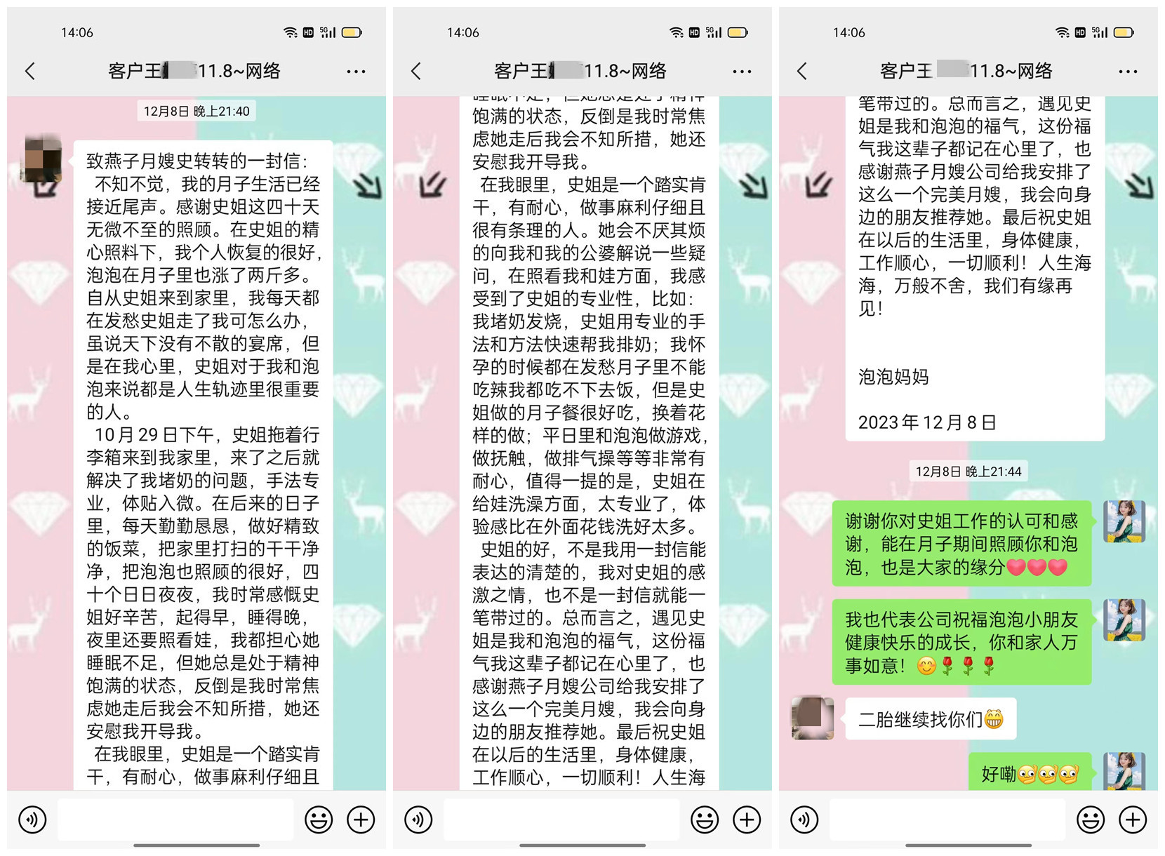 史姐的好,不是我用一封信能表達的清楚的,我對史姐的感激之情,也不是一封信就能一筆帶過的。總而言之,遇見史姐是我和泡泡的福氣,這份福氣我這輩子都記在心里了,也感謝燕子月嫂公司給我安排了這么一個完美月嫂,我會向身邊的朋友推薦她。最后祝史姐在以后的生活里,身體健康,工作順心,一切順利!人生海海,萬般不舍,我們有緣再見!
