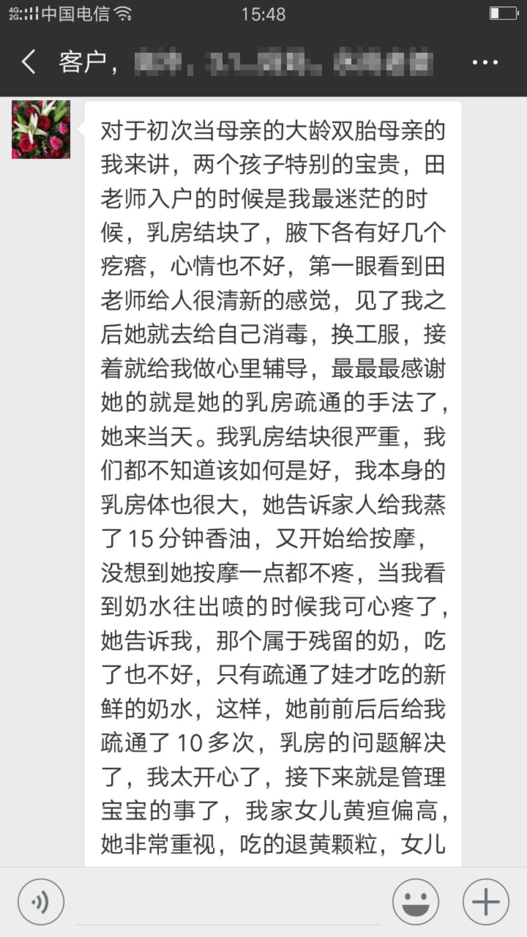 對于初次當母親的大齡雙胎母親的我來講,兩個孩子特別的寶貴,田老師入戶的時候是我最迷茫的時候,乳房結塊了,腋下各有好幾個疙瘩,心情也不好,第一眼看到田老師給人很清新的感覺,見了我之后她就去給自己消毒,換工服,接著就給我做心里輔導,最最最感謝她的就是她的乳房疏通的手法了,她來當天。我乳房結塊很嚴重,我們都不知道該如何是好,我本身的乳房體也很大,她告訴家人給我蒸了15分鐘香油,又開始給按摩,沒想到她按摩一點都不疼,當我看到奶水往出噴的時候我可心疼了,她告訴我,那個屬于殘留的奶,吃了也不好,只有疏通了娃才吃的新鮮的奶水,這樣,她前前后后給我疏通了10多次,乳房的問題解決了,我太開心了,接下來就是管理寶寶的事了,我家女兒黃疸偏高,她非常重視,吃的退黃顆粒,女兒拉的次數多了,屁股紅了,有點爛,她就天天給兩個寶寶中午那會曬半小時的太陽,幾乎天天給寶寶洗澡,關注寶寶臍帶的掉落,關注寶寶卡介傷口的愈合,最主要的也就是在管理寶寶吃這個難題上,她太厲害了,我家兒子那會吃的很慢,可以說20分鐘吃10毫升,開始的時候她會很辛苦,半夜偶爾會叫醒我給寶寶吃,我是個懶媽媽,晚上瞌睡太多,有時候她叫不醒我,她就給女兒先喂,喂飽了在給兒子喂。
