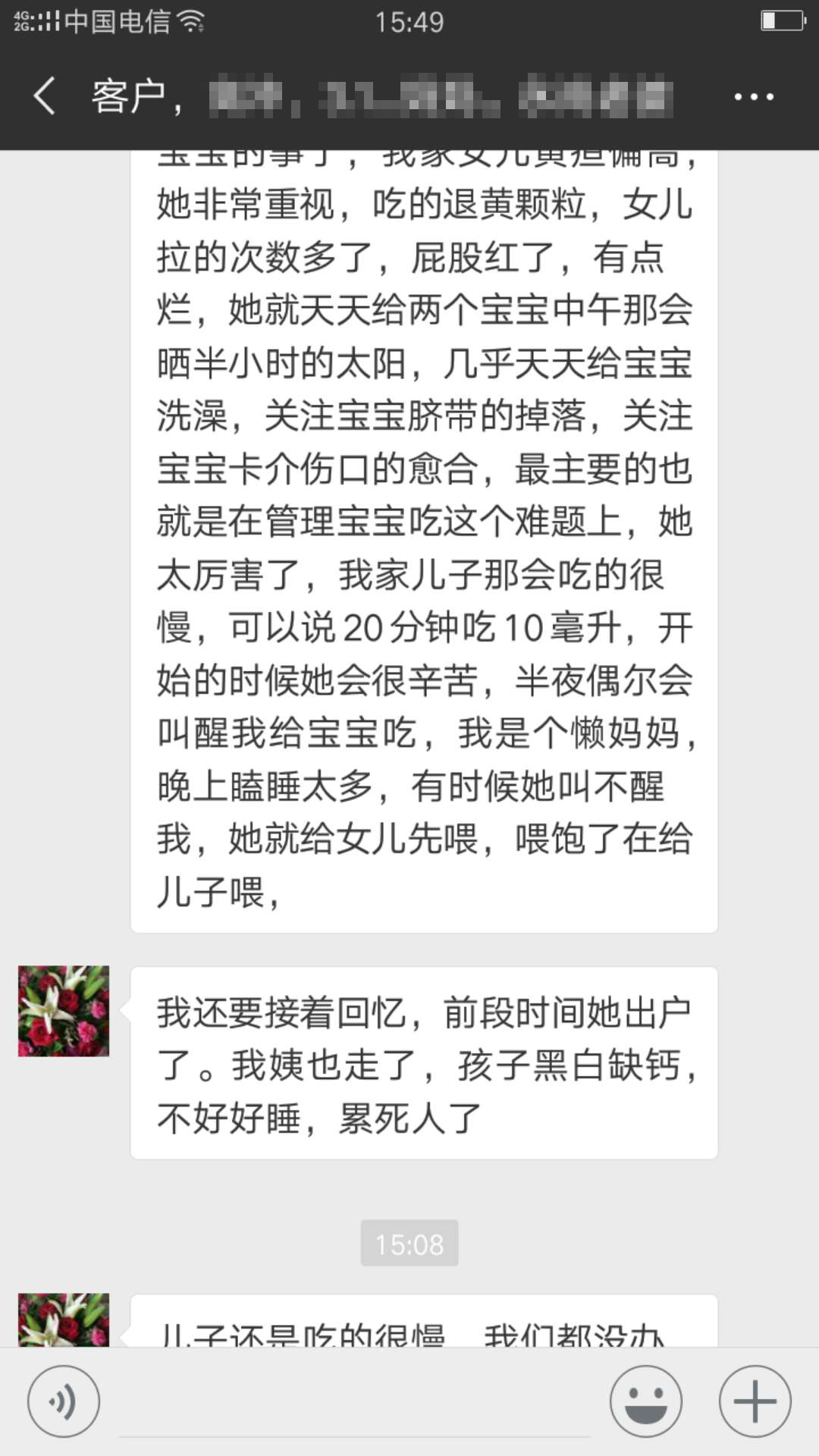 兒子還是吃的很慢,我們都沒辦法,她最后給寶寶鍛煉了嘴的吸力,慢慢的寶寶吃的好了,身體也長的快了,因為雙胎,她確實辛苦,對這個行業我很尊重,對田曉燕老師,我感謝,對于貴公司,我也是深深地感謝!