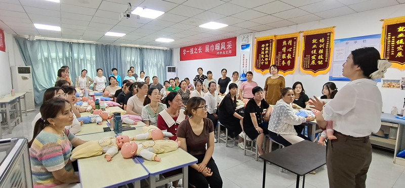 教室里,一群滿懷激情的女性正端坐在長條桌旁,桌上擺放著精致的嬰兒模型及相關教學材料,她們的眼神中透露出對知識的渴望與對未來的憧憬。墻上掛著的紅色橫幅——“就業促發展,培訓強技能;學一技之長,展巾幗風采”,不僅是對本次培訓目標的精煉概括,更是對每位學員的殷切期望。在這里,每一位女性都將有機會成為母嬰護理領域的佼佼者,展現屬于自己的巾幗風采。