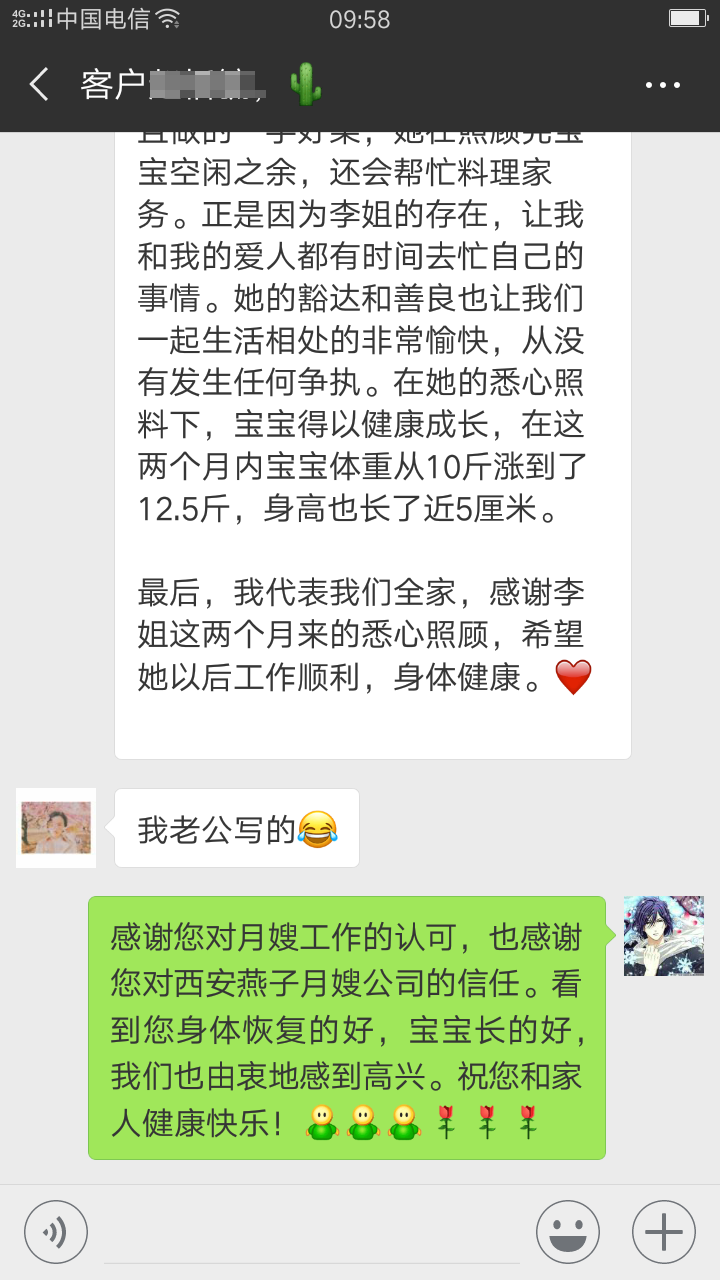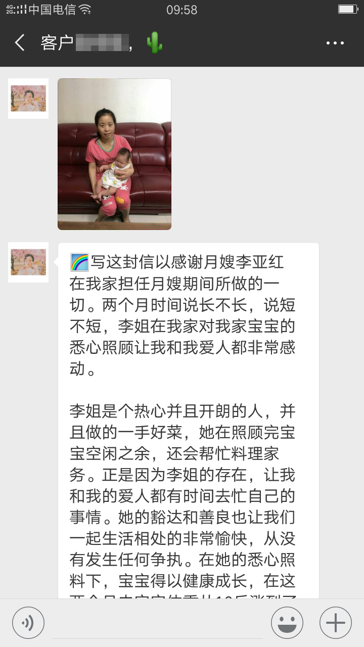 寫這封信以感謝月嫂李亞紅在我家擔(dān)任月嫂期間所做的一切。兩個月時間說長不長,說短不短,李姐在我家對我家寶寶的悉心照顧讓我和我愛人都非常感動。