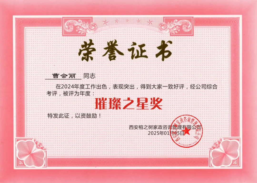 2024 年,曹會麗收獲了無數來自客戶的感激與認可。一面面錦旗,承載著 “媽媽放心 寶寶開心”“專業嫻熟 服務周到” 的贊譽,是對她辛勤付出的最好證明。公司授予她 “璀璨之星獎”,更是對她全年出色表現的高度肯定。