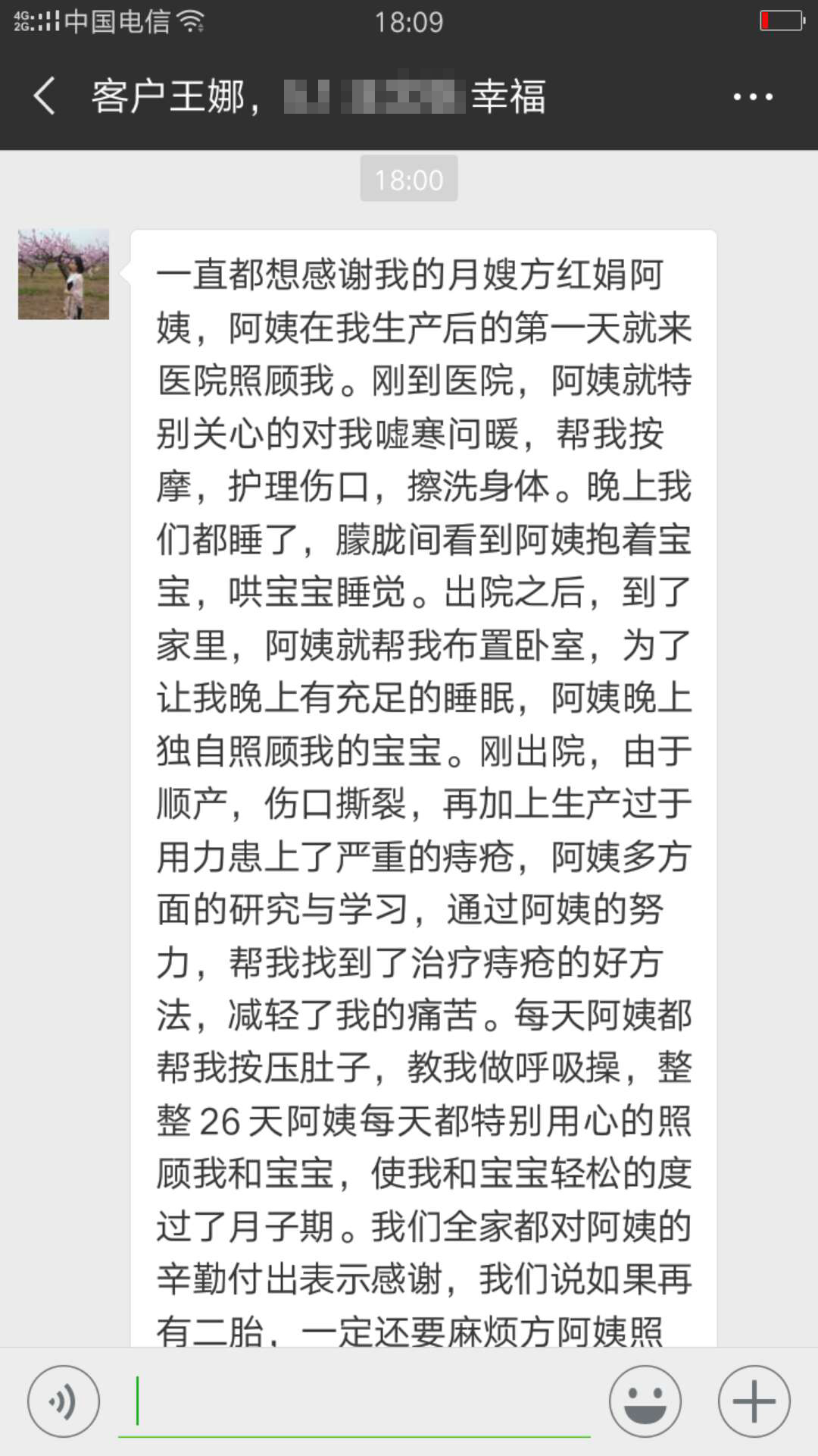 一直都想感謝我的月嫂方紅娟阿姨,阿姨在我生產后的第一天就來醫院照顧我。剛到醫院,阿姨就特別關心的對我噓寒問暖,幫我按摩,護理傷口,擦洗身體。晚上我們都睡了,朦朧間看到阿姨抱著寶寶,哄寶寶睡覺。出院之后,到了家里,阿姨就幫我布置臥室,為了讓我晚上有充足的睡眠,阿姨晚上獨自照顧我的寶寶。剛出院,由于順產,傷口撕裂,再加上生產過于用力患上了嚴重的痔瘡,阿姨多方面的研究與學習,通過阿姨的努力,幫我找到了治療痔瘡的好方法,減輕了我的痛苦。每天阿姨都幫我按壓肚子,教我做呼吸操,整整26天阿姨每天都特別用心的照顧我和寶寶,使我和寶寶輕松的度過了月子期。我們全家都對阿姨的辛勤付出表示感謝,我們說如果再有二胎,一定還要麻煩方阿姨照顧,阿姨真是對我和寶寶很用心很貼心!
