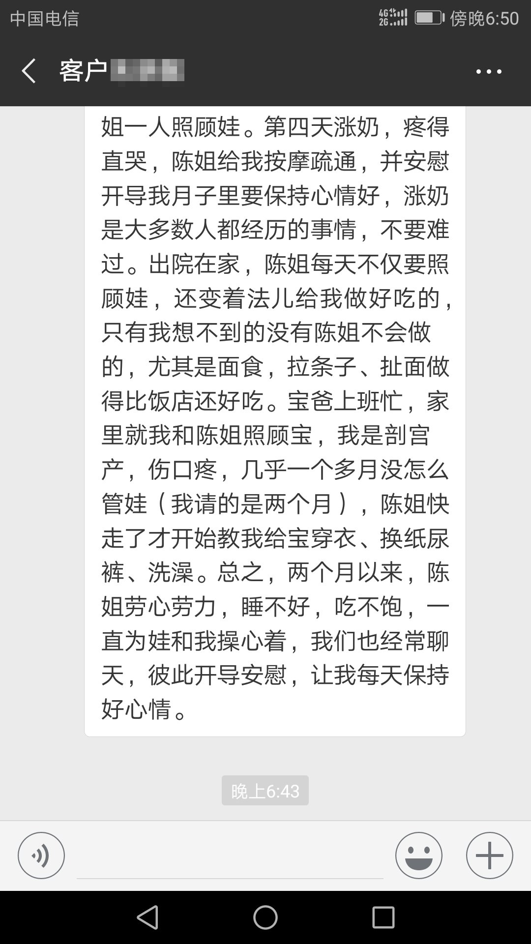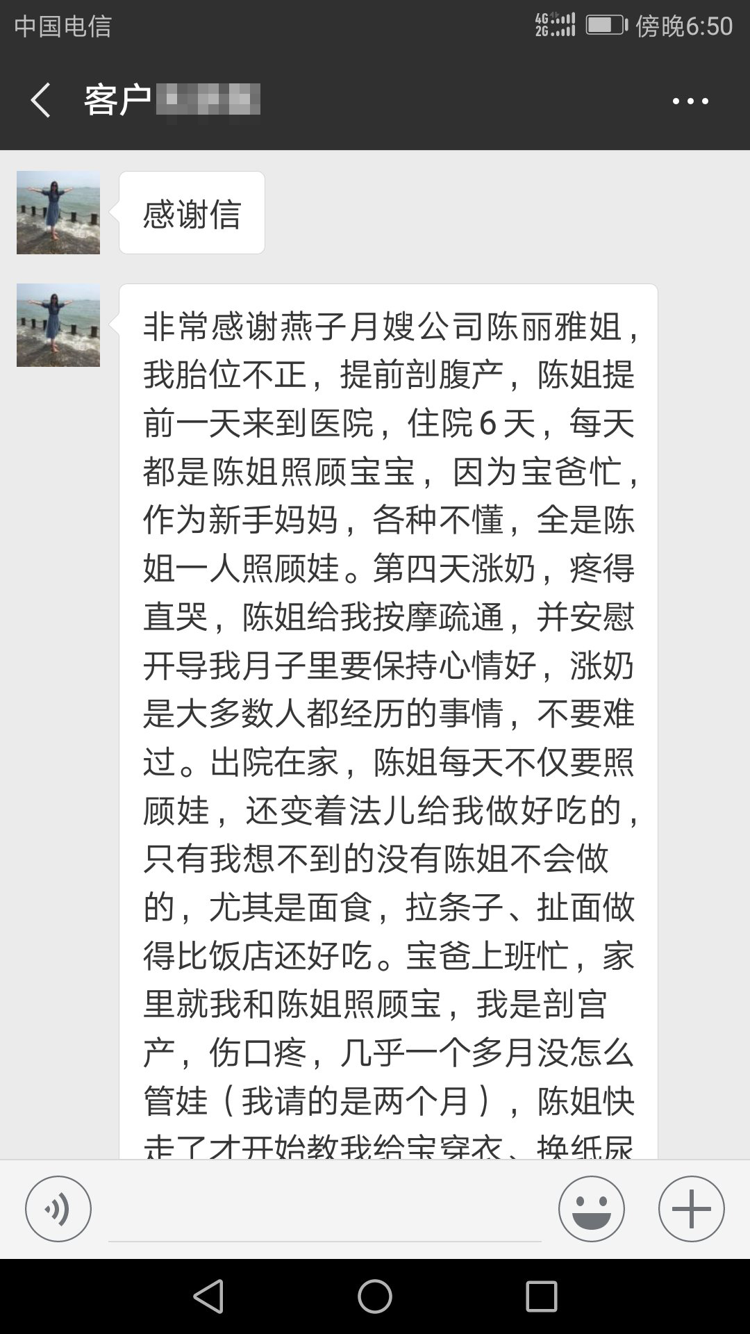非常感謝燕子月嫂公司陳利婭,我胎位不正,提前剖腹產,陳姐提前一天來到醫院,住院6天,每天都是陳姐照顧寶寶,因為寶爸忙,作為新手媽媽,各種不懂,全是陳姐一人照顧娃。第四天漲奶,疼得直哭,陳姐給我按摩疏通,并安慰開導我月子里要保持心情好,漲奶是大多數人都經歷的事情,不要難過。出院在家,陳姐每天不僅要照顧娃,還變著法兒給我做好吃的,只有我想不到的沒有陳姐不會做的,尤其是面食,拉條子、扯面做得比飯店還好吃。寶爸上班忙,家里就我和陳姐照顧寶,我是剖宮產,傷口疼,幾乎一個多月沒怎么管娃(我請的是兩個月),陳姐快走了才開始教我給寶穿衣、換紙尿褲、洗澡??傊?,兩個月以來,陳姐勞心勞力,睡不好,吃不飽,一直為娃和我操心著,我們也經常聊天,彼此開導安慰,讓我每天保持好心情。