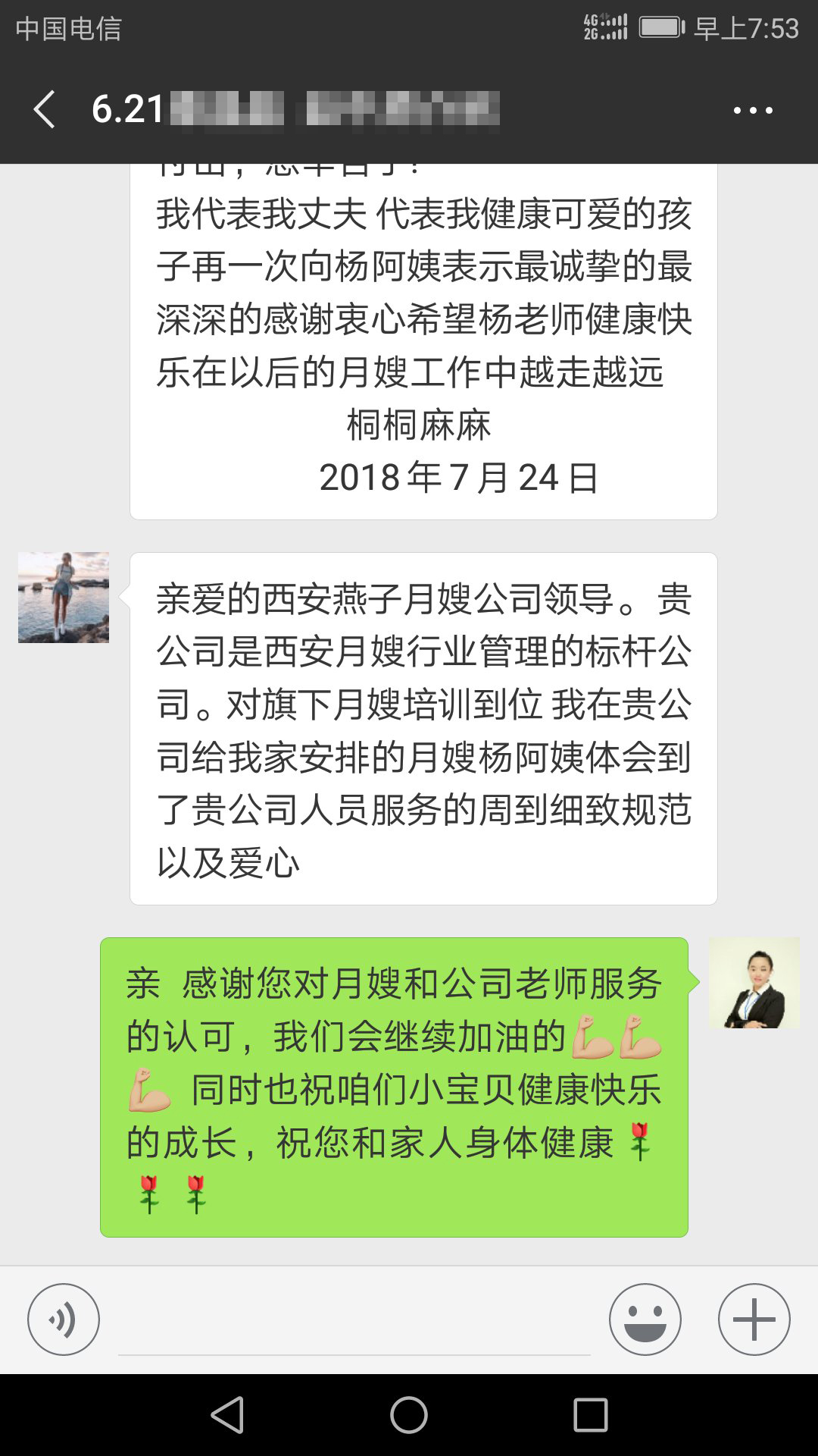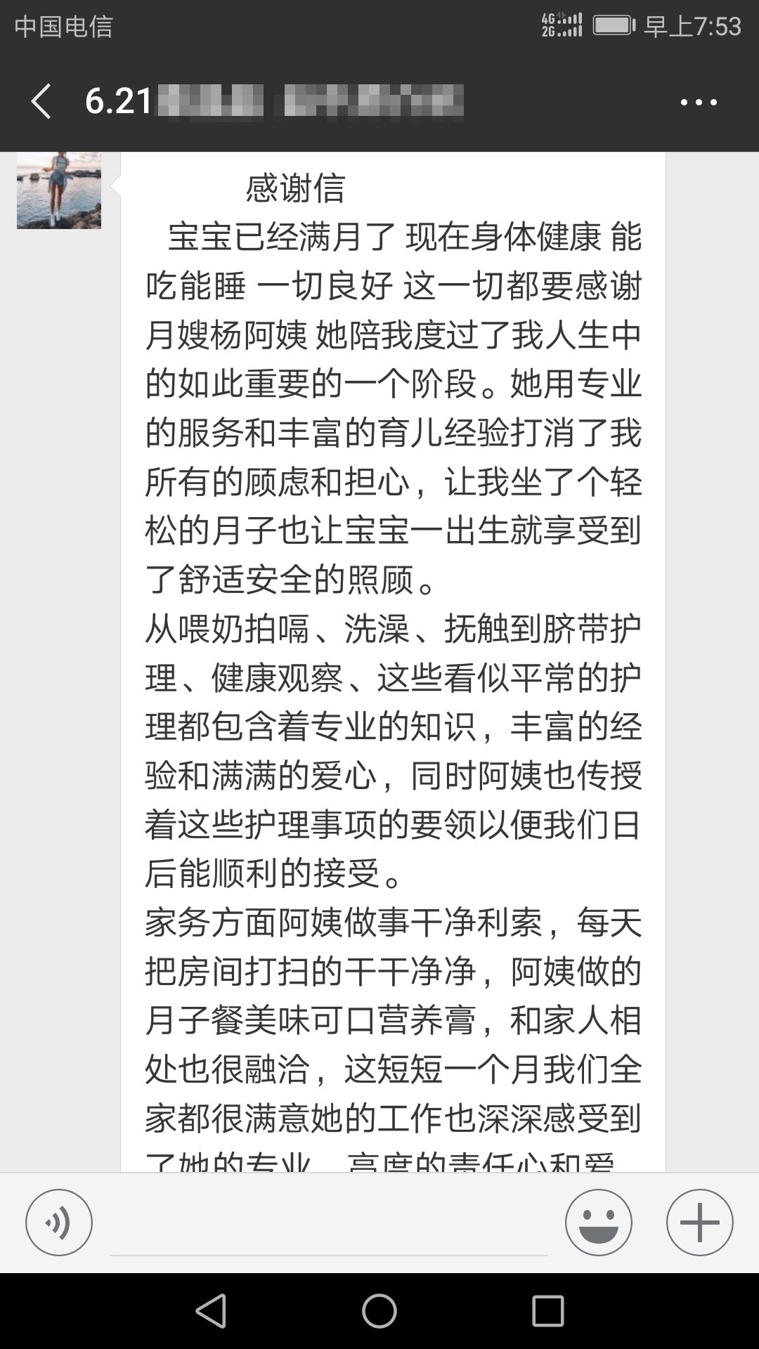 我代表我丈夫 代表我健康可愛的孩子再一次向楊阿姨表示最誠摯的最深深的感謝衷心希望楊老師健康快樂在以后的月嫂工作中越走越遠。