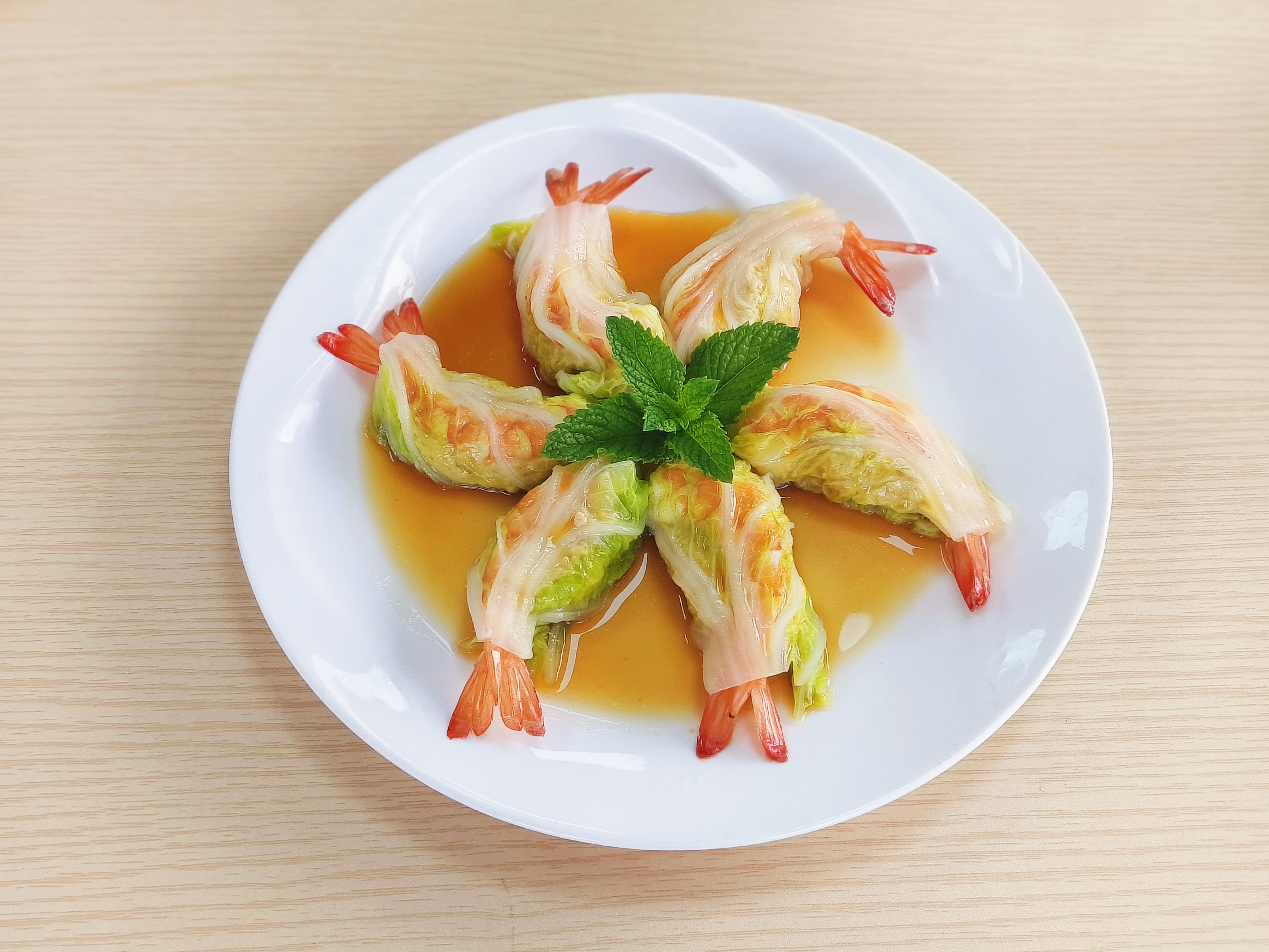 4、帶上手套,用白菜葉包住肉餡和一個蝦仁,將蝦尾留在外面,熱鍋上籠,蒸制15分鐘。
