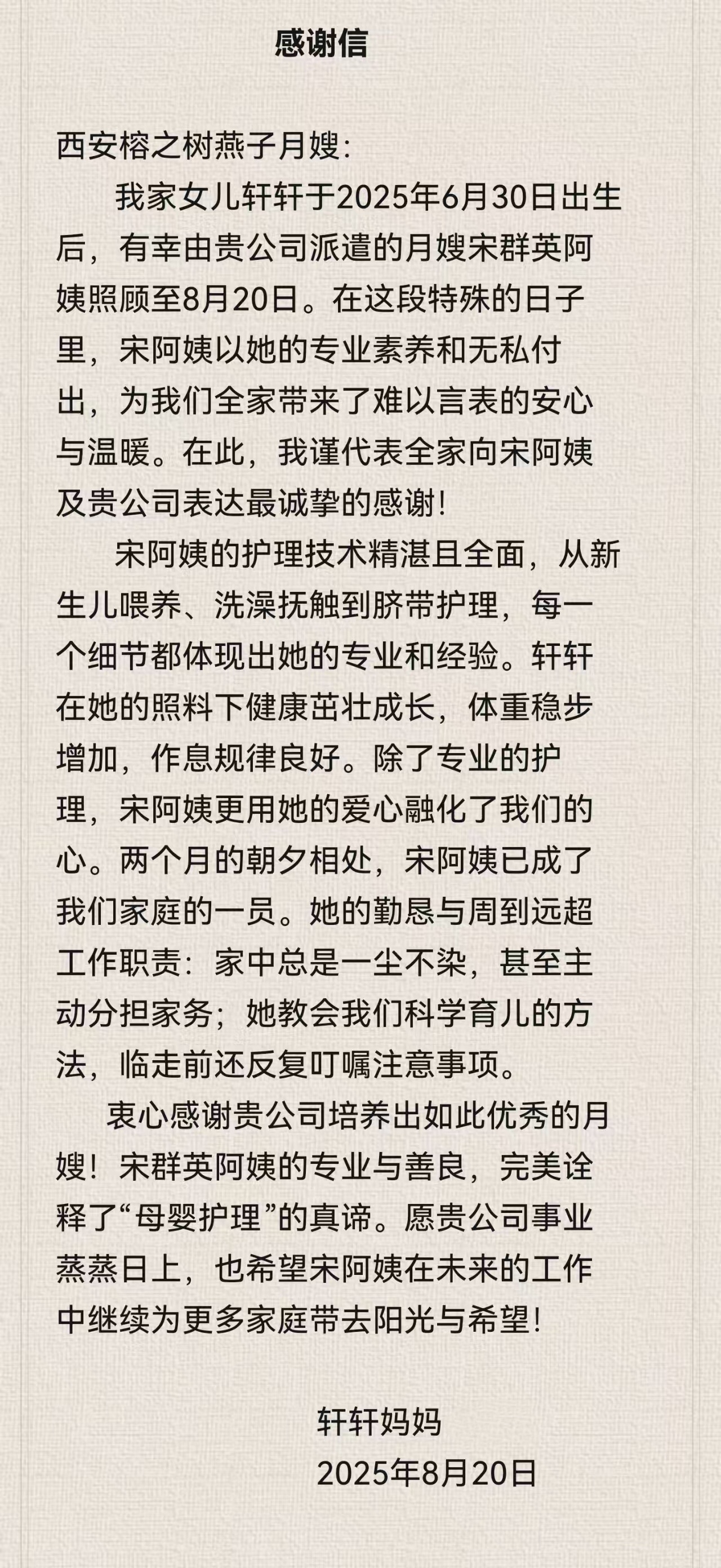 我家女兒軒軒于2025年6月30日出生后,有幸由貴公司派遣的月嫂宋群英阿姨照顧至8月20日。在這段特殊的日子里,宋阿姨以她的專業素養和無私付出,為我們全家帶來了難以言表的安心與溫暖。在此,我謹代表全家向宋阿姨及貴公司表達最誠摯的感謝!