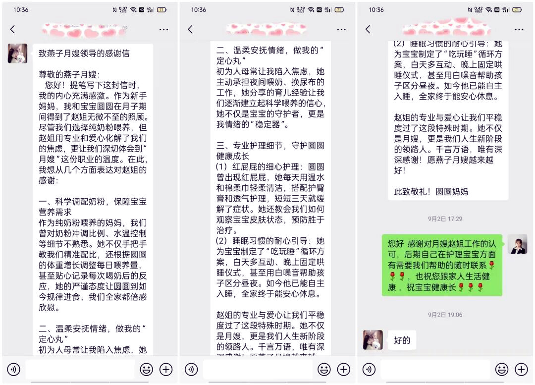 提筆寫下這封信時,我的內心充滿感激。作為新手媽媽,我和寶寶圓圓在月子期間得到了趙姐無微不至的照顧。盡管我們選擇純奶粉喂養,但趙姐用專業和愛心化解了我們的焦慮,更讓我們深切體會到“月嫂”這份職業的溫度。在此,我想從幾個方面表達對趙姐的感謝:
