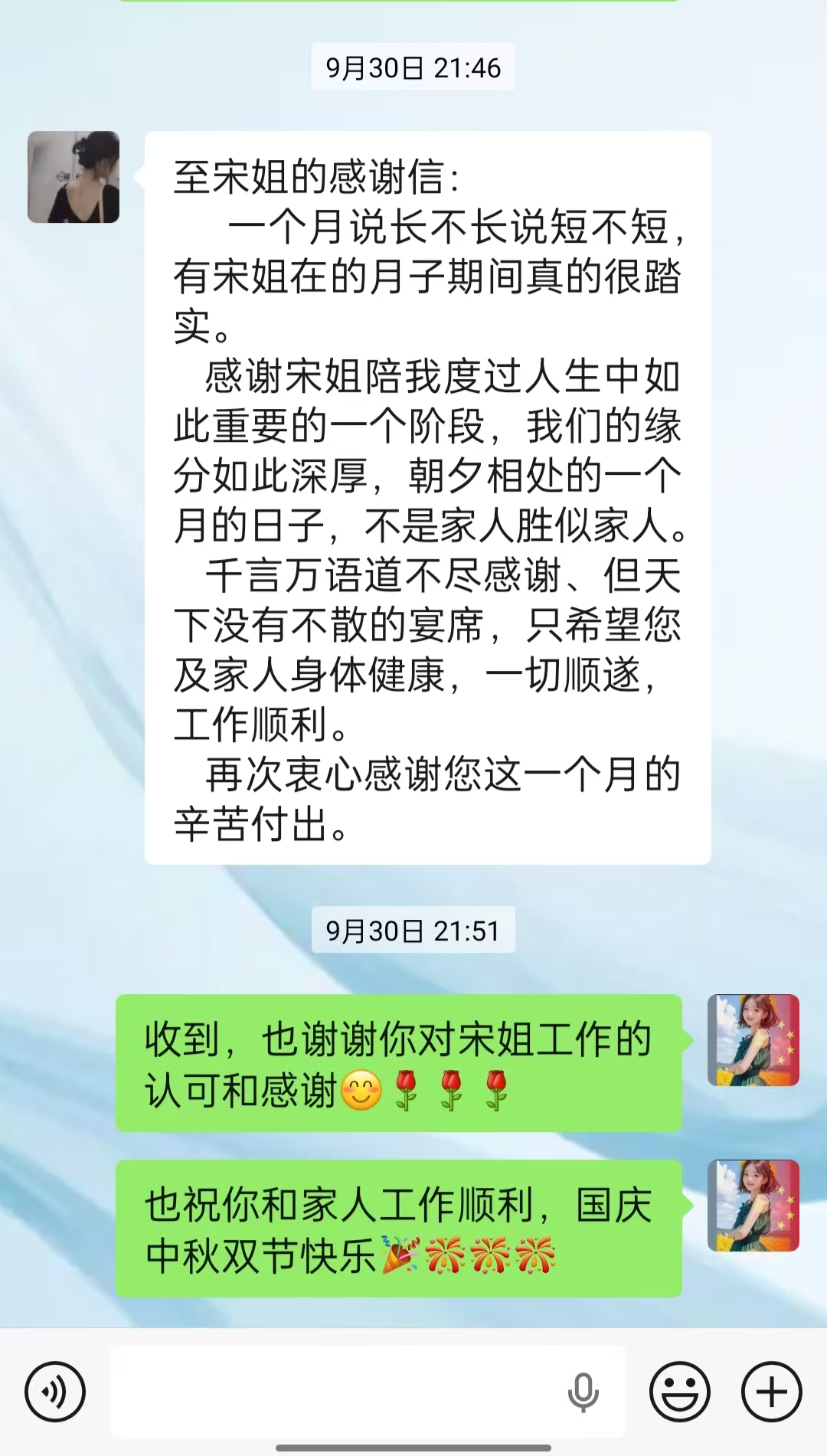 感謝宋姐陪我度過人生中如此重要的一個階段,我們的緣分如此深厚,朝夕相處的一個月的日子,不是家人勝似家人。千言萬語道不盡感謝、但天下沒有不散的宴席,只希望您及家人身體健康,一切順遂,工作順利。
