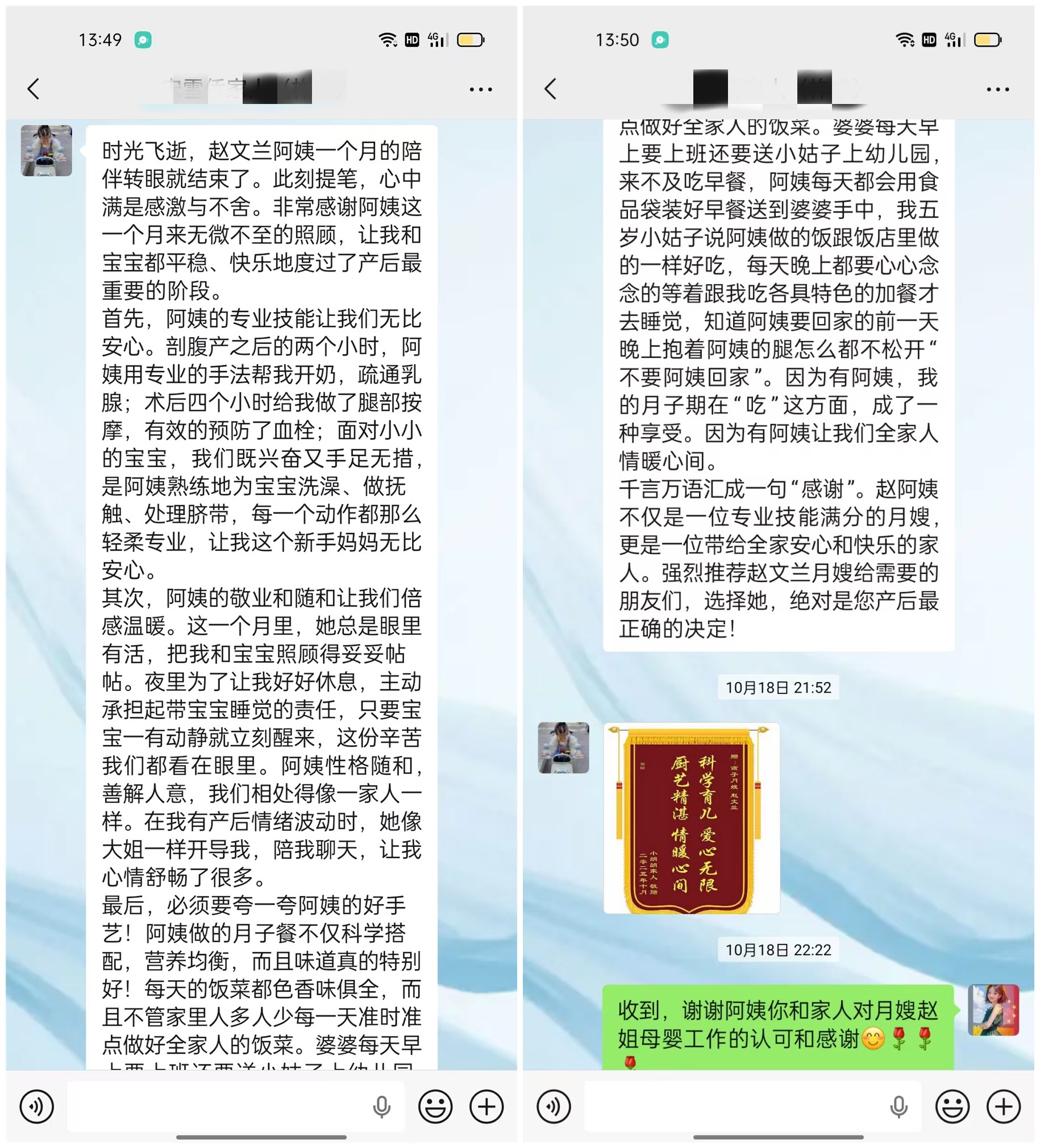 時(shí)光飛逝,趙文蘭阿姨一個(gè)月的陪伴轉(zhuǎn)眼就結(jié)束了。此刻提筆,心中滿是感激與不舍。非常感謝阿姨這一個(gè)月來(lái)無(wú)微不至的照顧,讓我和寶寶都平穩(wěn)、快樂(lè)地度過(guò)了產(chǎn)后最重要的階段。
