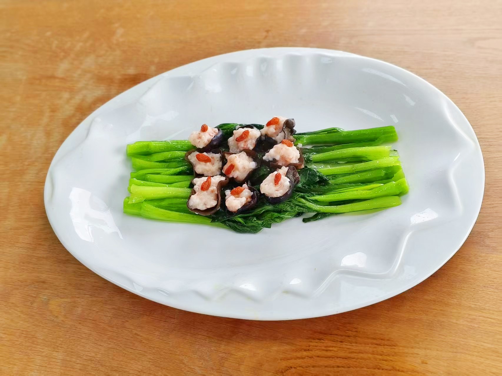 13、將蒸好的木耳釀蝦滑,均勻擺在芥菜上,就可以開始享受美食啦!
