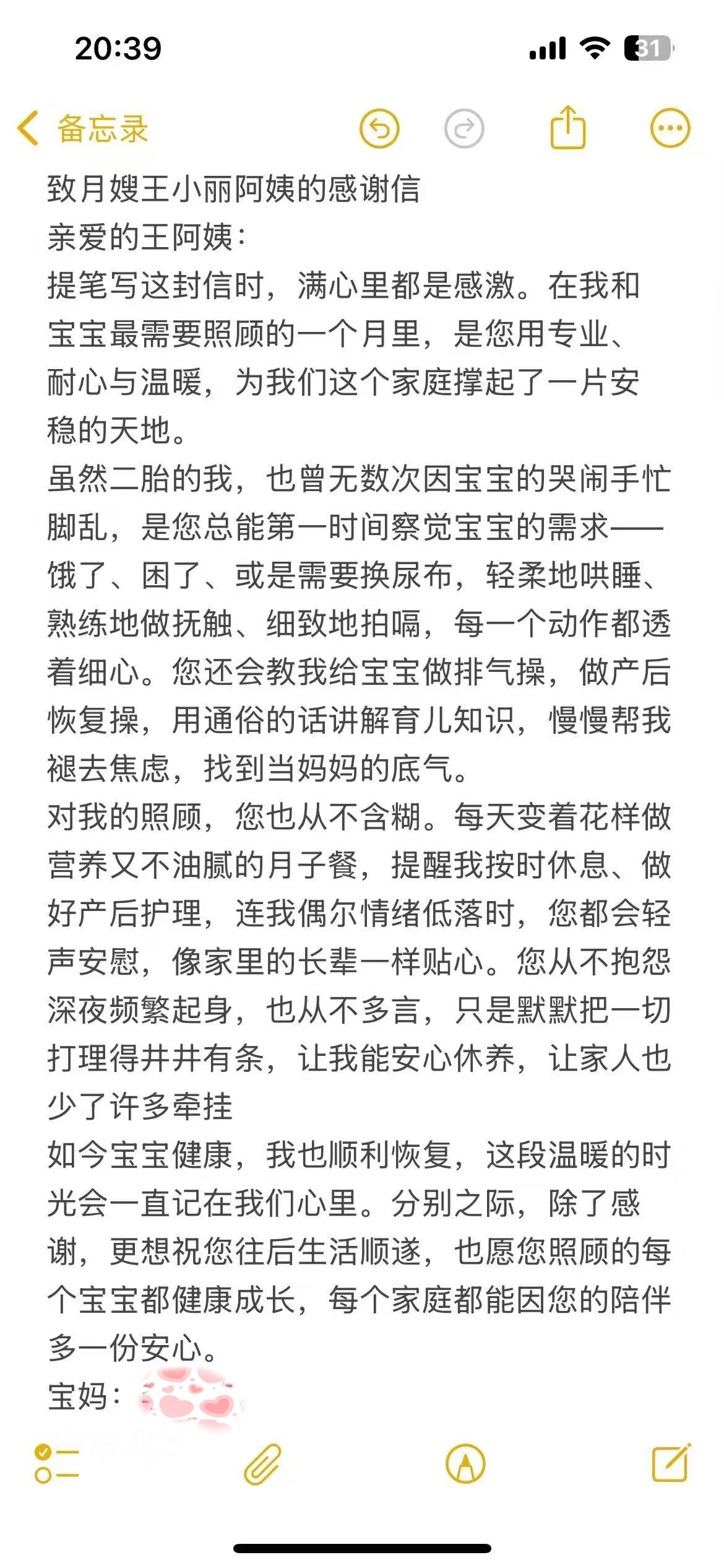 提筆寫這封信時,滿心里都是感激。在我和寶寶最需要照顧的一個月里,是您用專業、耐心與溫暖,為我們這個家庭撐起了一片安穩的天地。