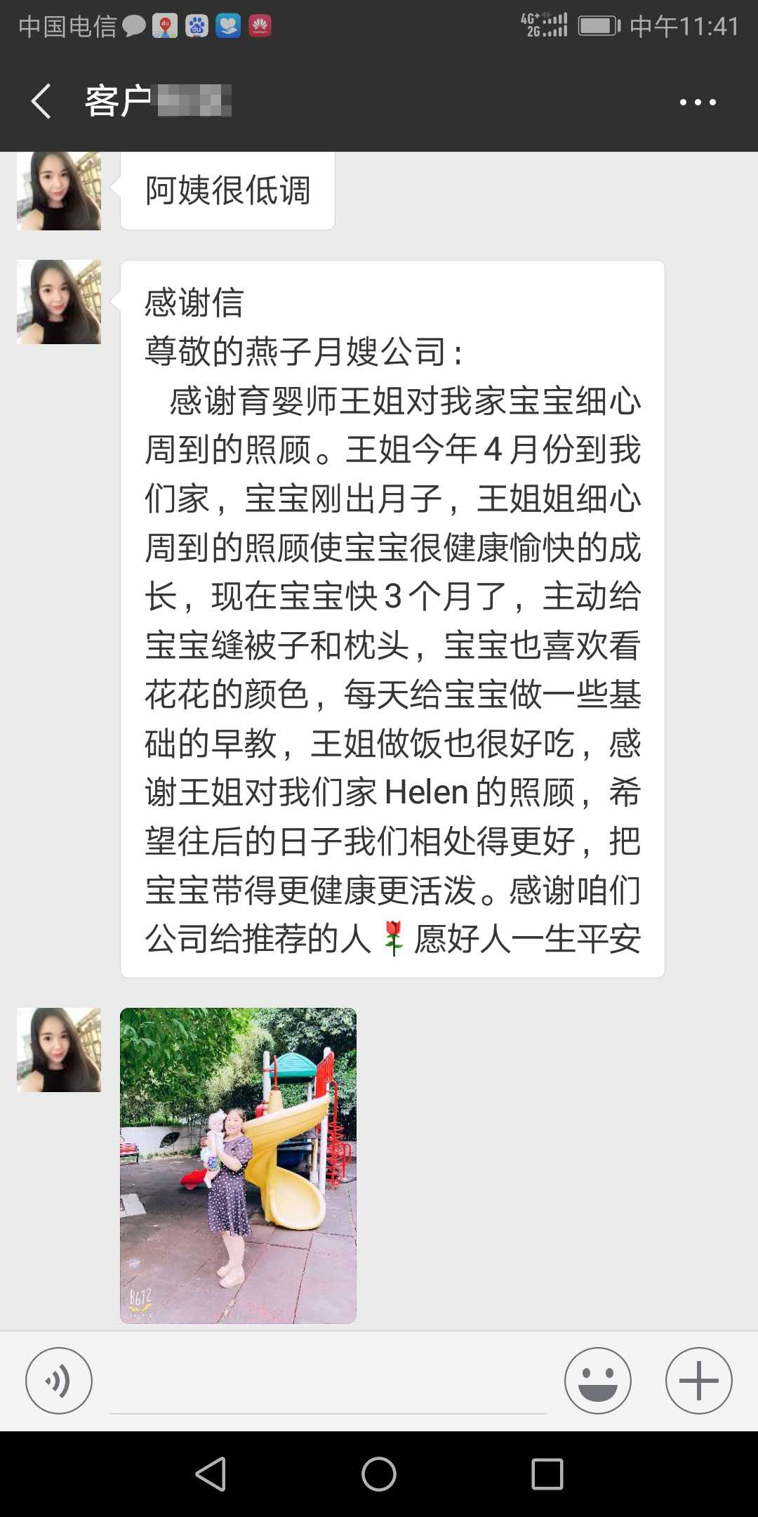 感謝育嬰師王姐對我家寶寶細心周到的照顧。王姐今年4月份到我們家,寶寶剛出月子,王姐姐細心周到的照顧使寶寶很健康愉快的成長,現在寶寶快3個月了,主動給寶寶縫被子和枕頭,寶寶也喜歡看花花的顏色,每天給寶寶做一些基礎的早教,王姐做飯也很好吃,感謝王姐對我們家Helen的照顧,希望往后的日子我們相處得更好,把寶寶帶得更健康更活潑。感謝咱們公司給推薦的人愿好人一生平安。