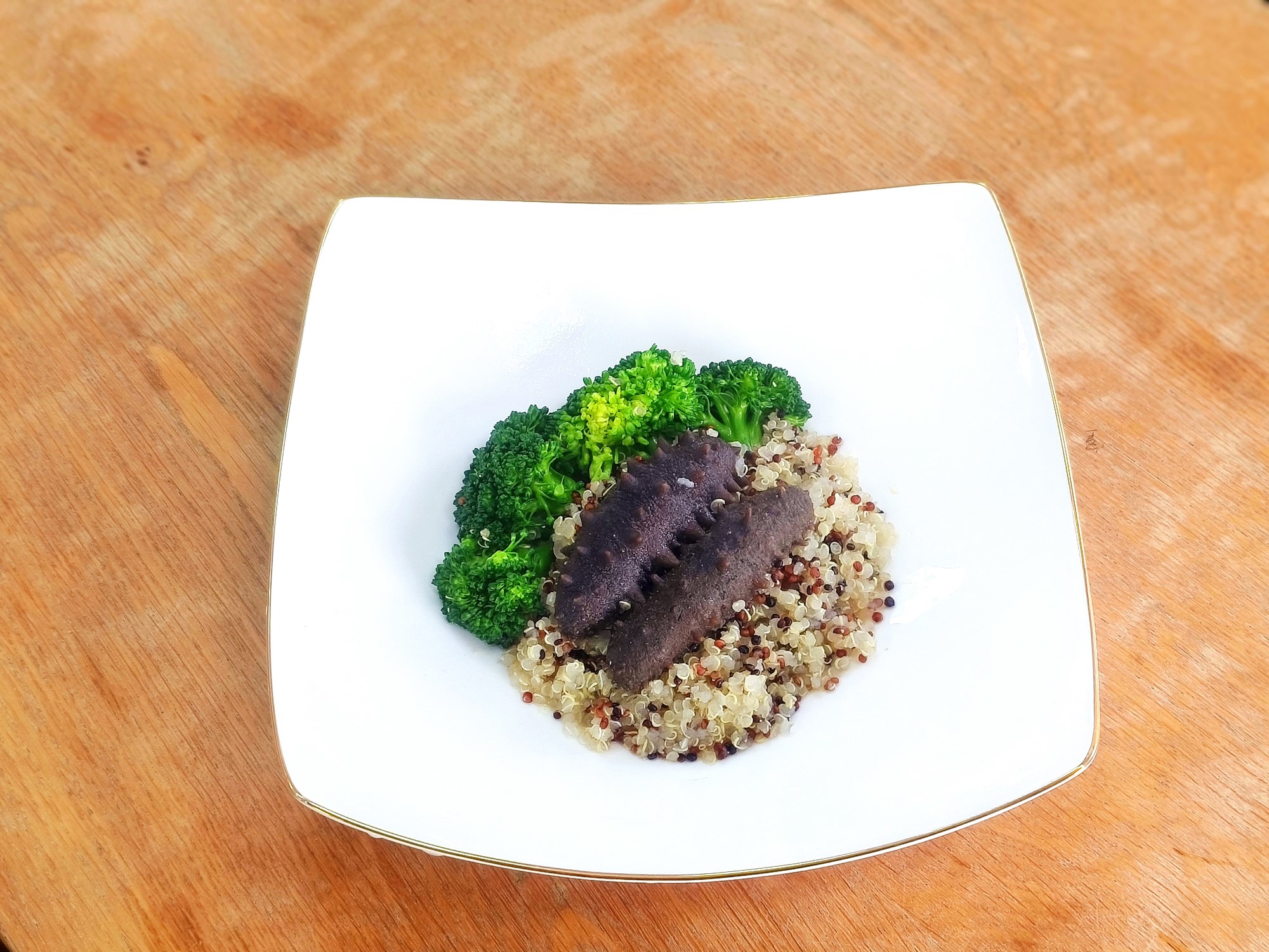 4、清炒幾朵西蘭花,出鍋裝盤作為點綴,藜麥撈海參就完成啦!