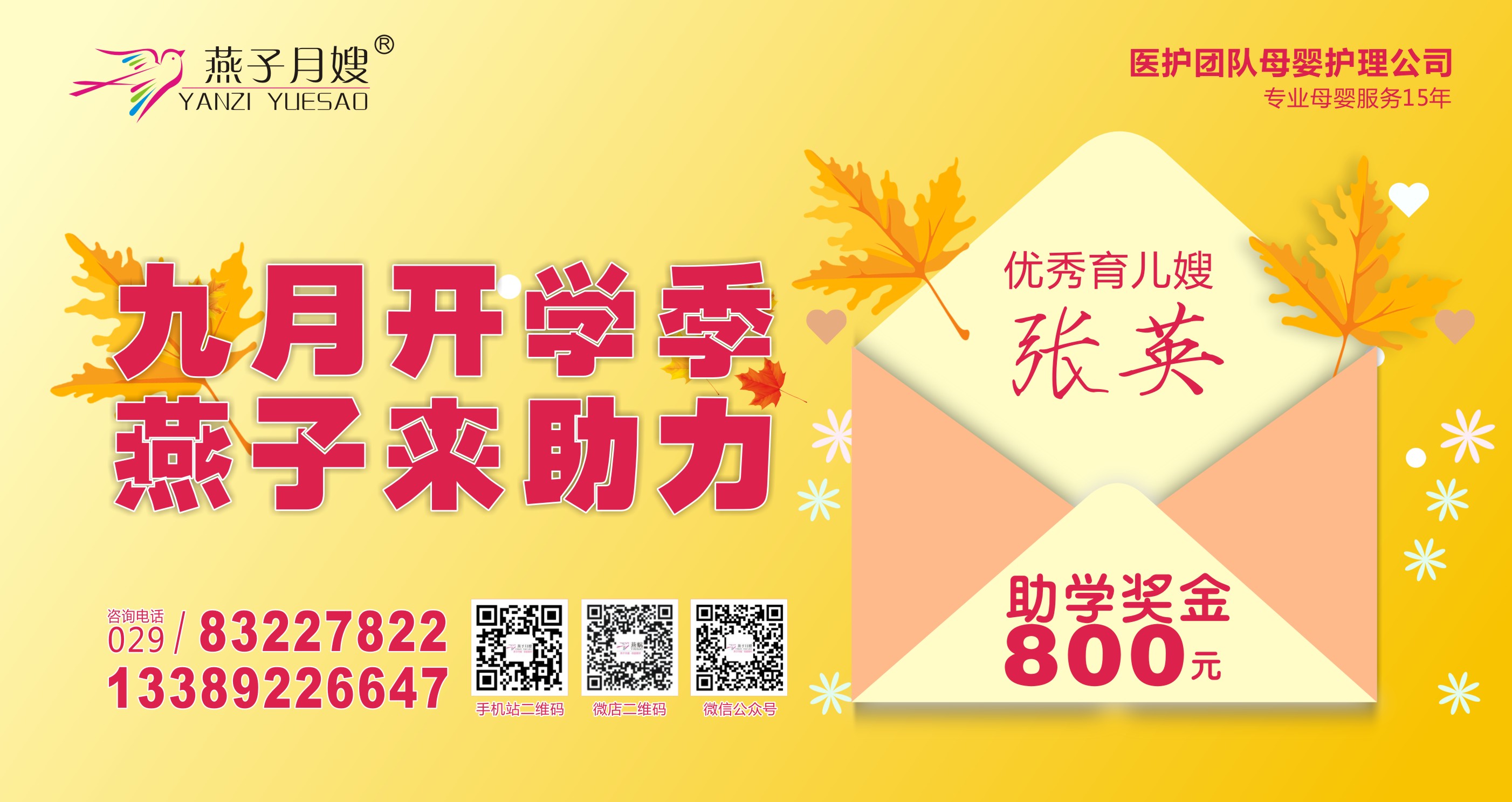正值9月開學季,燕子月嫂公司有近十位月嫂/育兒嫂家庭都有今年高考入學的大學生,這幾位優秀的員工,她們不僅自己工作認真負責,得到很多客戶表揚信和錦旗,而且言傳身教,培養出優秀的孩子。現在孩子們都考上了心儀的大學,為了表彰這些優秀又可愛的月嫂/育兒嫂,鼓勵她們的孩子,公司通過嚴格審查,最終評選出優秀員工——張英,獎勵助學金800元。
