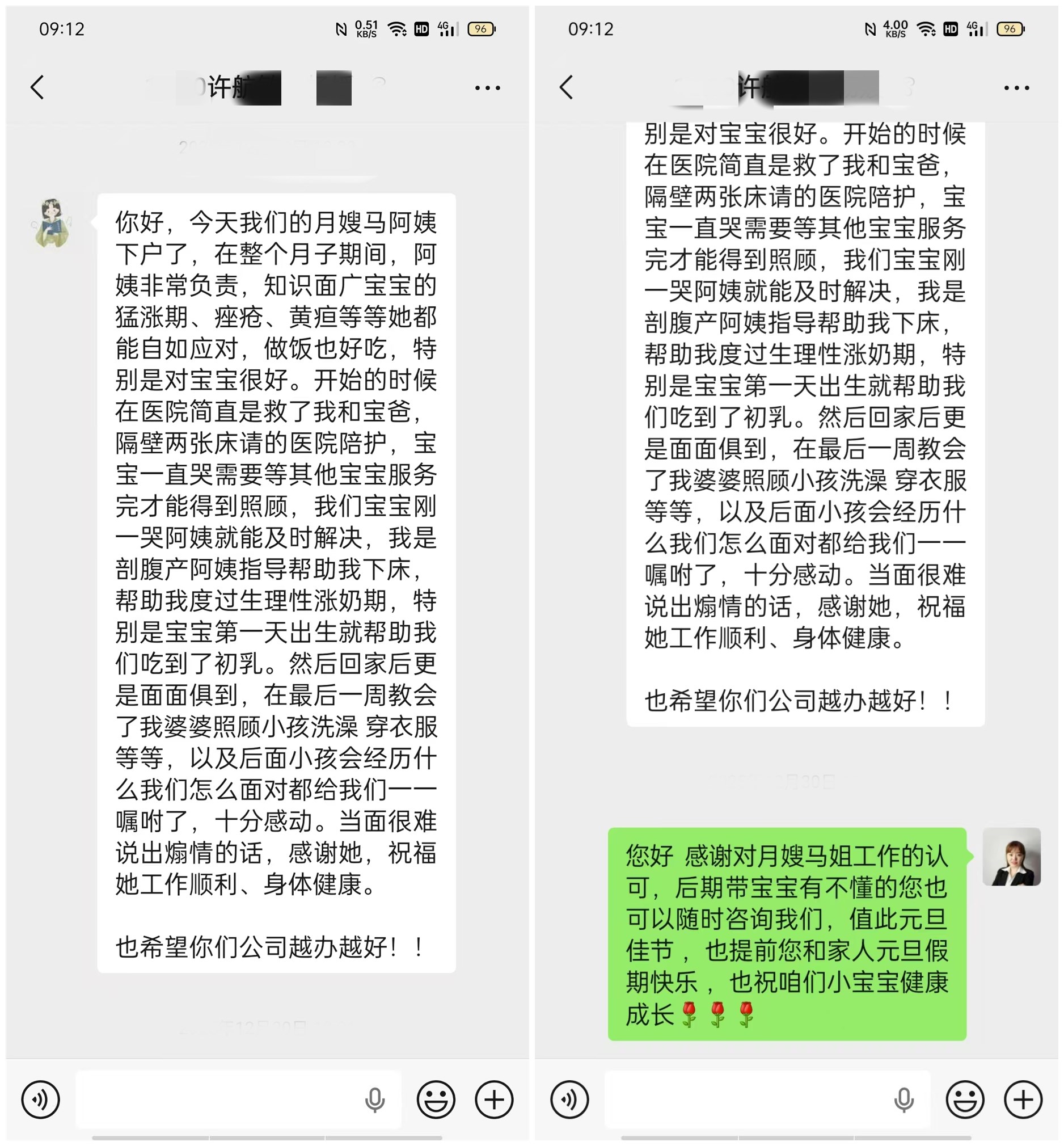 你好,今天我們的#月嫂# 馬阿姨下戶了,在整個月子期間,阿姨非常負責,知識面廣寶寶的猛漲期、痤瘡、黃疸等等她都能自如應對,做飯也好吃,特別是對寶寶很好。開始的時候在醫院簡直是救了我和寶爸,隔壁兩張床請的醫院陪護,寶寶一直哭需要等其他寶寶服務完才能得到照顧,我們寶寶剛一哭阿姨就能及時解決,我是剖腹產阿姨指導幫助我下床,幫助我度過生理性漲奶期,特別是寶寶第一天出生就幫助我們吃到了初乳。然后回家后更是面面俱到,在最后一周教會了我婆婆照顧小孩洗澡 穿衣服等等,以及后面小孩會經歷什么我們怎么面對都給我們一一囑咐了,十分感動。當面很難說出煽情的話,感謝她,祝福她工作順利、身體健康。也希望你們公司越辦越好!