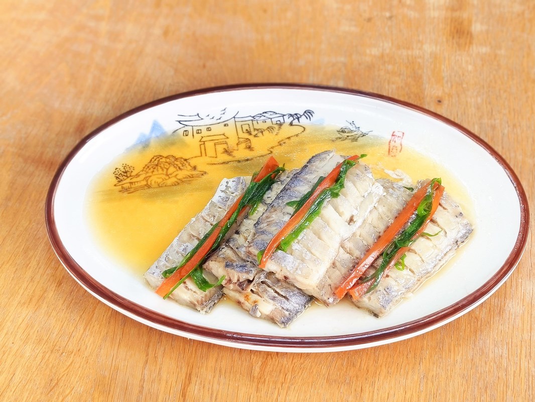 8、蒸好的帶魚,夾出蔥、姜,倒掉湯汁,淋上燒好的料汁即可!
