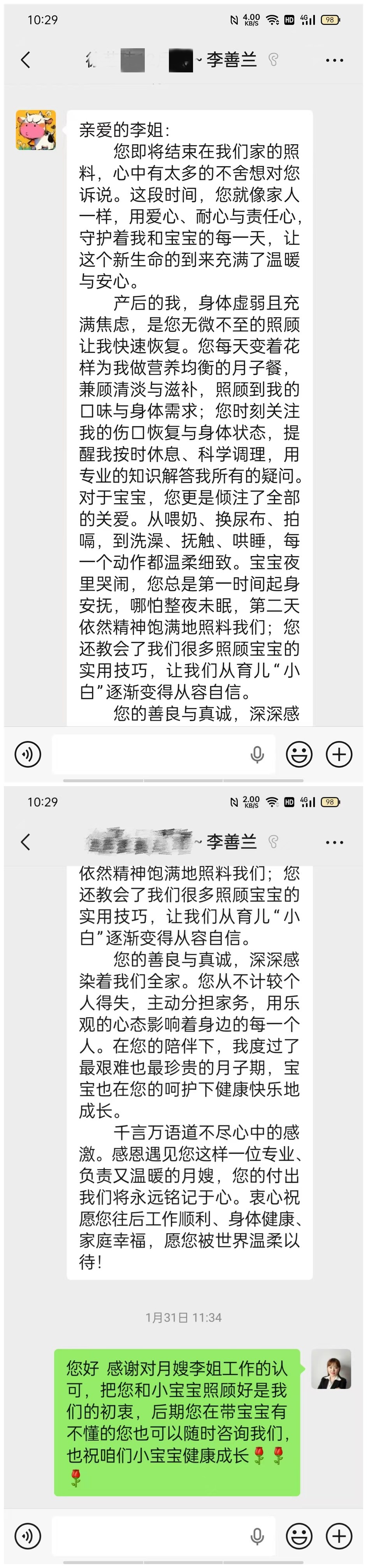 您即將結束在我們家的照料,心中有太多的不舍想對您訴說。這段時間,您就像家人一樣,用愛心、耐心與責任心,守護著我和寶寶的每一天,讓這個新生命的到來充滿了溫暖與安心。