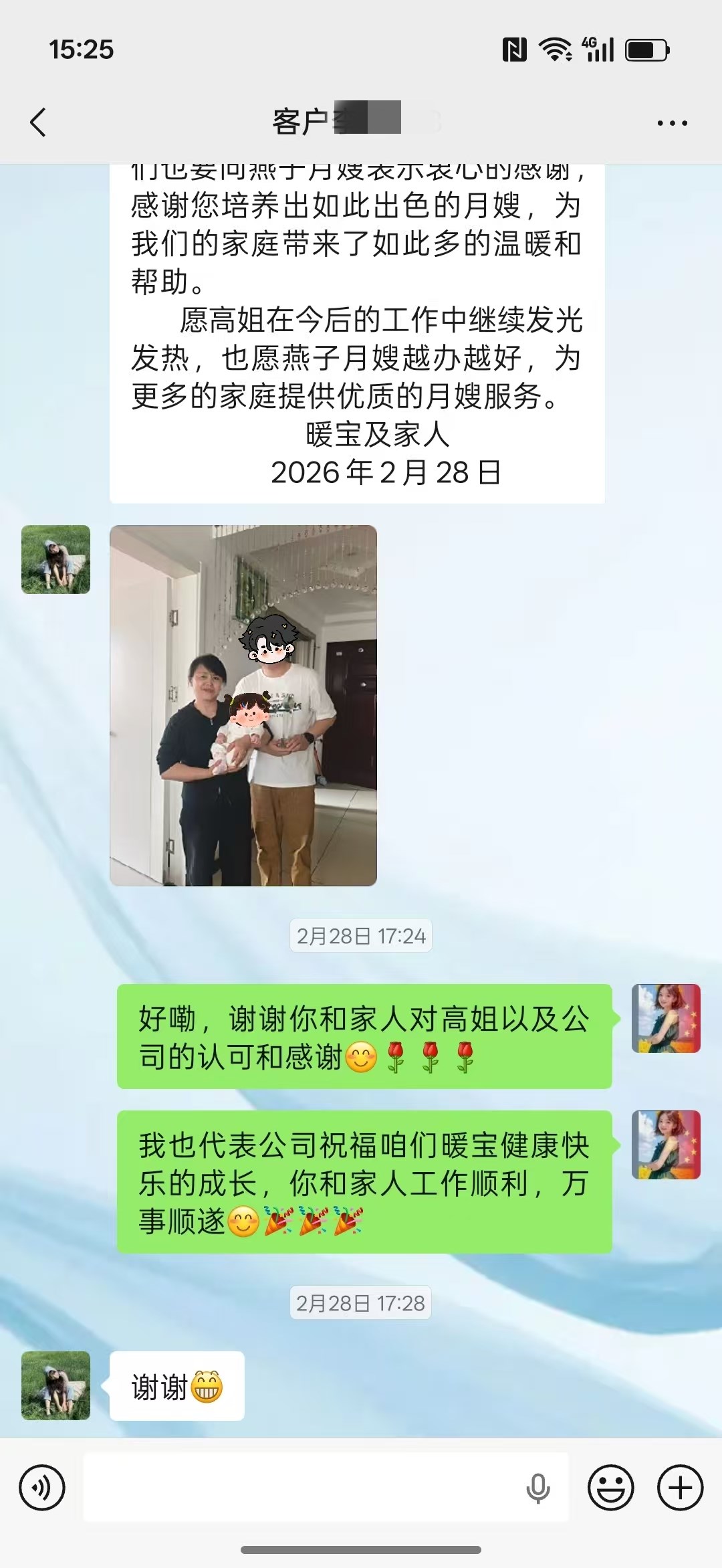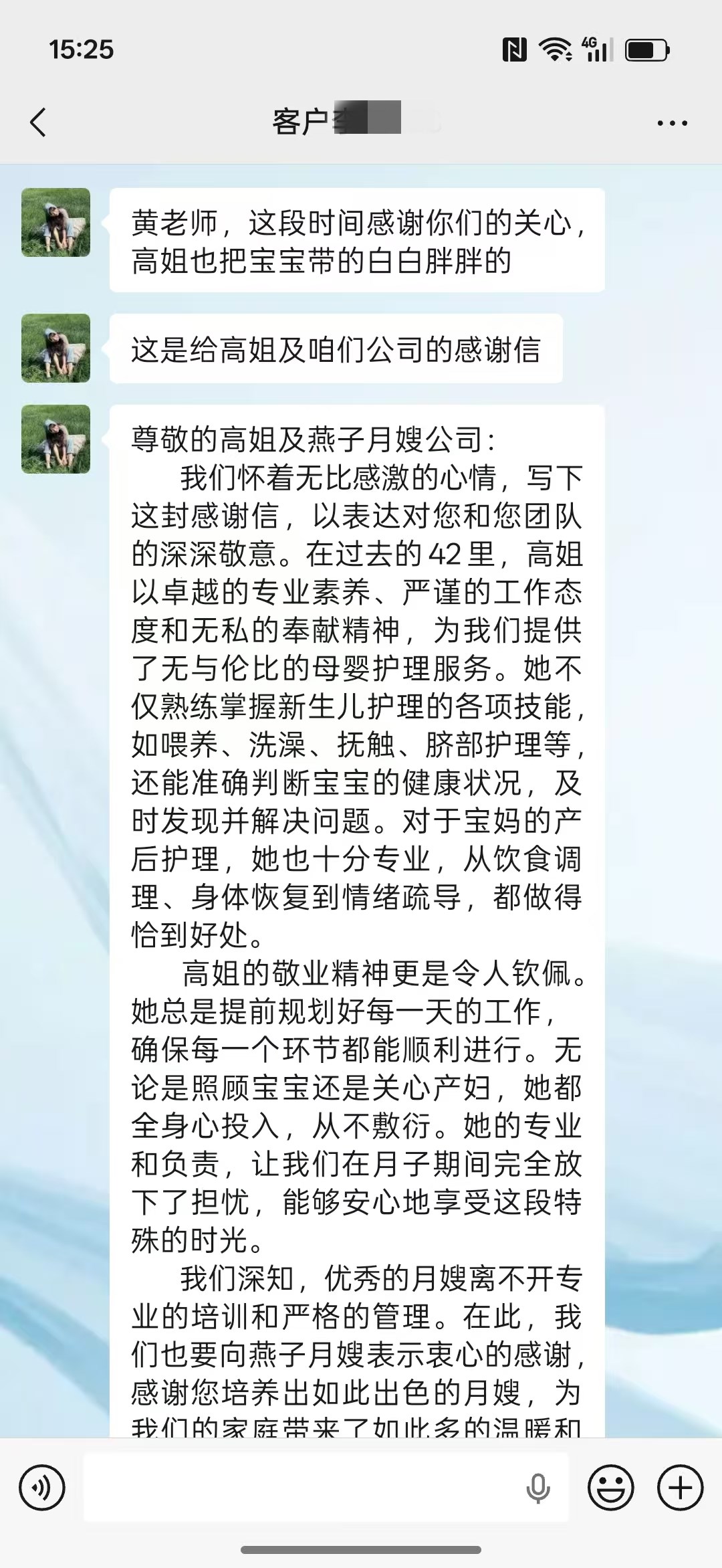 我們懷著無比感激的心情,寫下這封感謝信,以表達對您和您團隊的深深敬意。在過去的42里,高姐以卓越的專業素養、嚴謹的工作態度和無私的奉獻精神,為我們提供了無與倫比的母嬰護理服務。她不僅熟練掌握新生兒護理的各項技能,如喂養、洗澡、撫觸、臍部護理等,還能準確判斷寶寶的健康狀況,及時發現并解決問題。對于寶媽的產后護理,她也十分專業,從飲食調理、身體恢復到情緒疏導,都做得恰到好處。