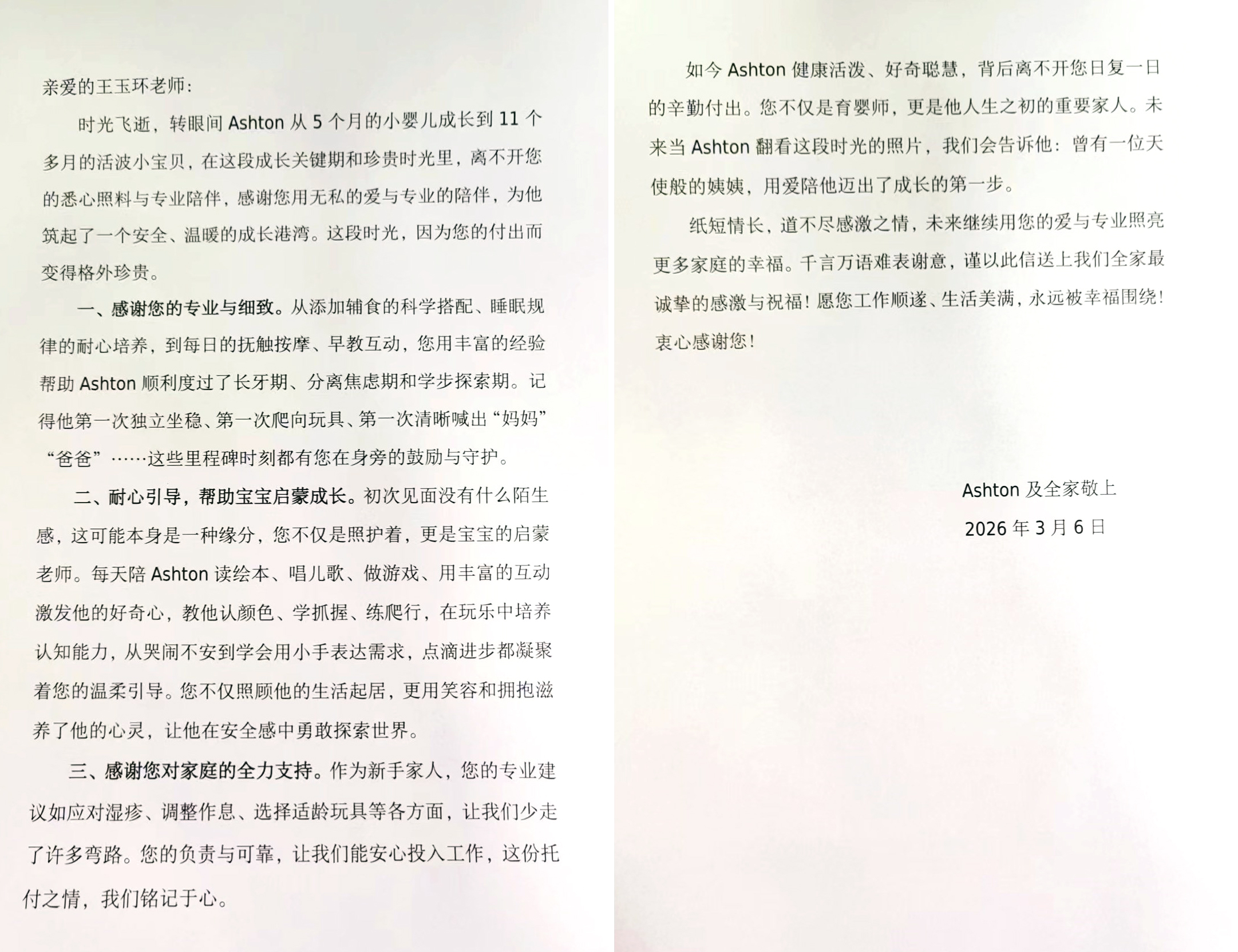 如今Ashton健康活潑、好奇聰慧,背后離不開您日復一日的辛勤付出。您不僅是育嬰師,更是他人生之初的重要家人。未來當Ashton翻看這段時光的照片,我們會告訴他:曾有一位天使般的姨姨,用愛陪他邁出了成長的第一步。