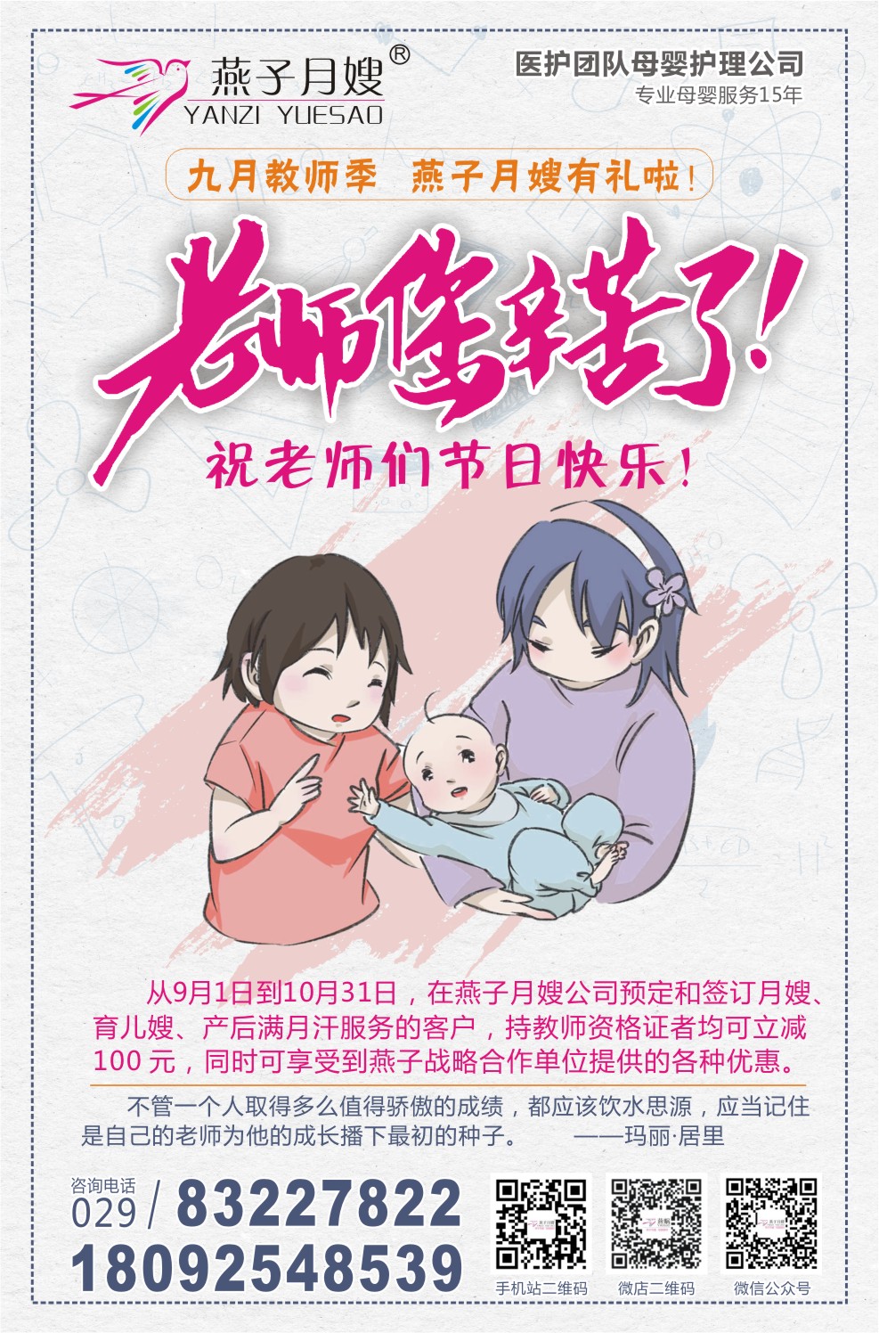 從9月1日到10月31日,在燕子月嫂公司預定和簽訂月嫂、育兒嫂、產后滿月汗服務的客戶,持教師資格證者均可立減 100 元,同時可享受到燕子戰略合作單位提供的各種優惠。