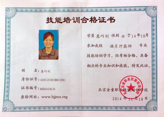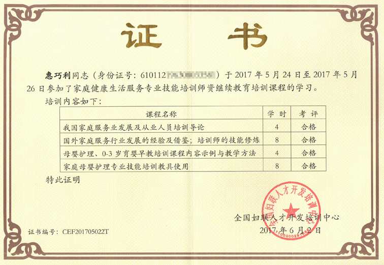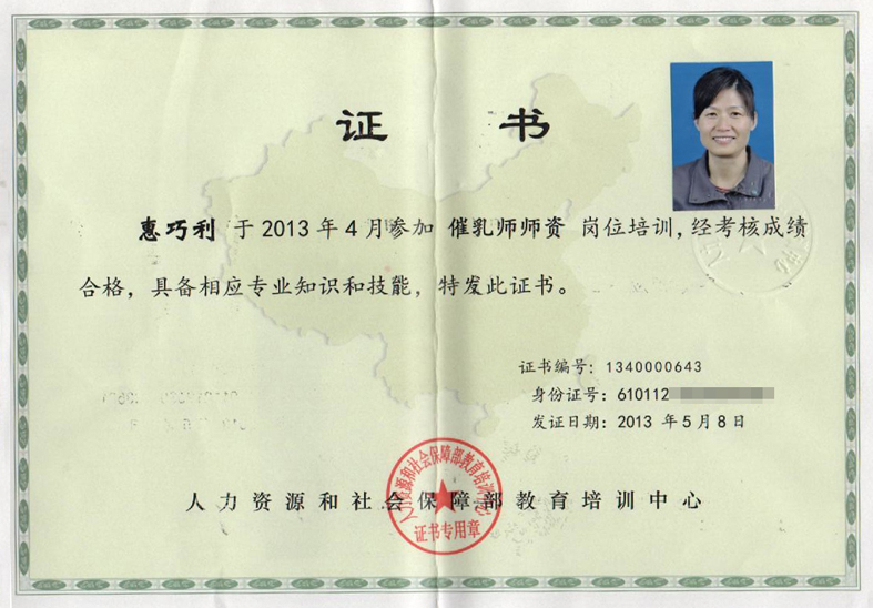 2013年在北京金童職業技術學校學習先進的催乳師技術和培訓經驗,成績優異,并獲得了人社部頒發的高級催乳師和高級催乳師師資雙證。同年,和燕子月嫂公司其他老師一起開辦首期專業催乳師培訓,是西安市最早專為提高月嫂技能而開辦的催乳師培訓班,為公司的“無奶瓶月嫂”品牌立下汗馬功勞。