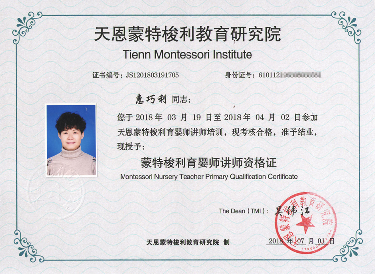 2018年,新的征程,新的行業。惠巧利老師又踏上了學習的征途。不畏辛苦,和來自全國各地的優秀老師一起,參加蒙特梭利早教育嬰師講師培訓班,成績優異,并獲得師資證書。