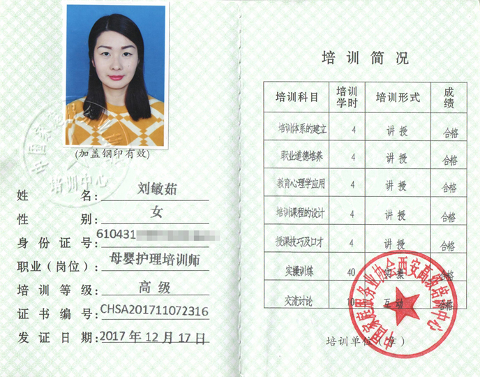 完成各項日常工作的同時,劉敏茹老師也在不斷的學習,提升自己。2014-2018年,先后參加了高級催乳師、高級小兒推拿師培訓,并取得相關專業(yè)證書。