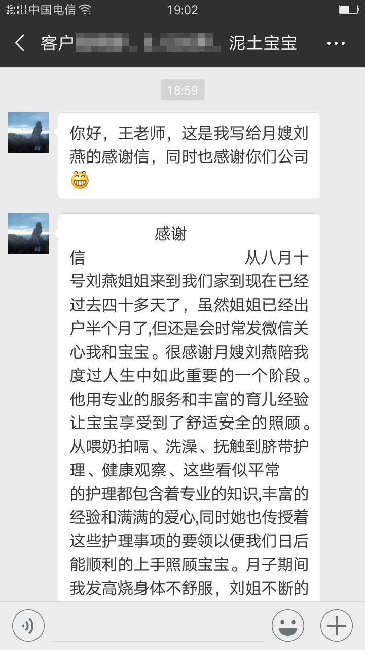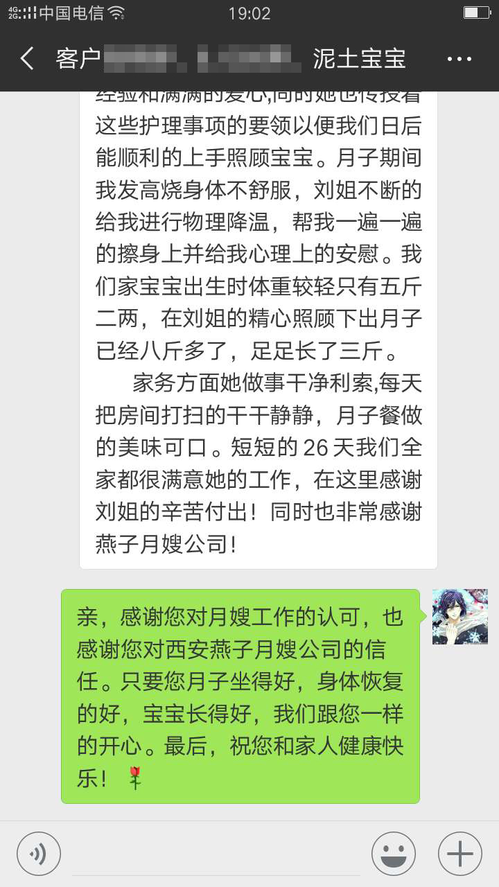 家務(wù)方面她做事干凈利索,每天把房間打掃的干干靜靜,月子餐做的美味可口。短短的26天我們?nèi)叶己軡M意她的工作,在這里感謝劉姐的辛苦付出!同時也非常感謝燕子月嫂公司!
