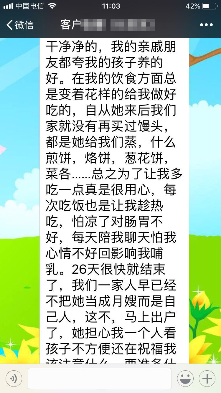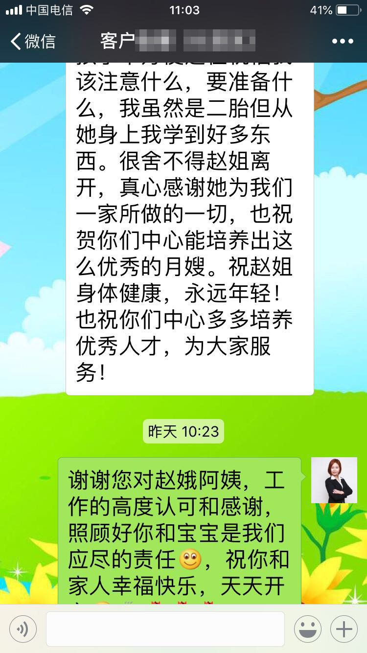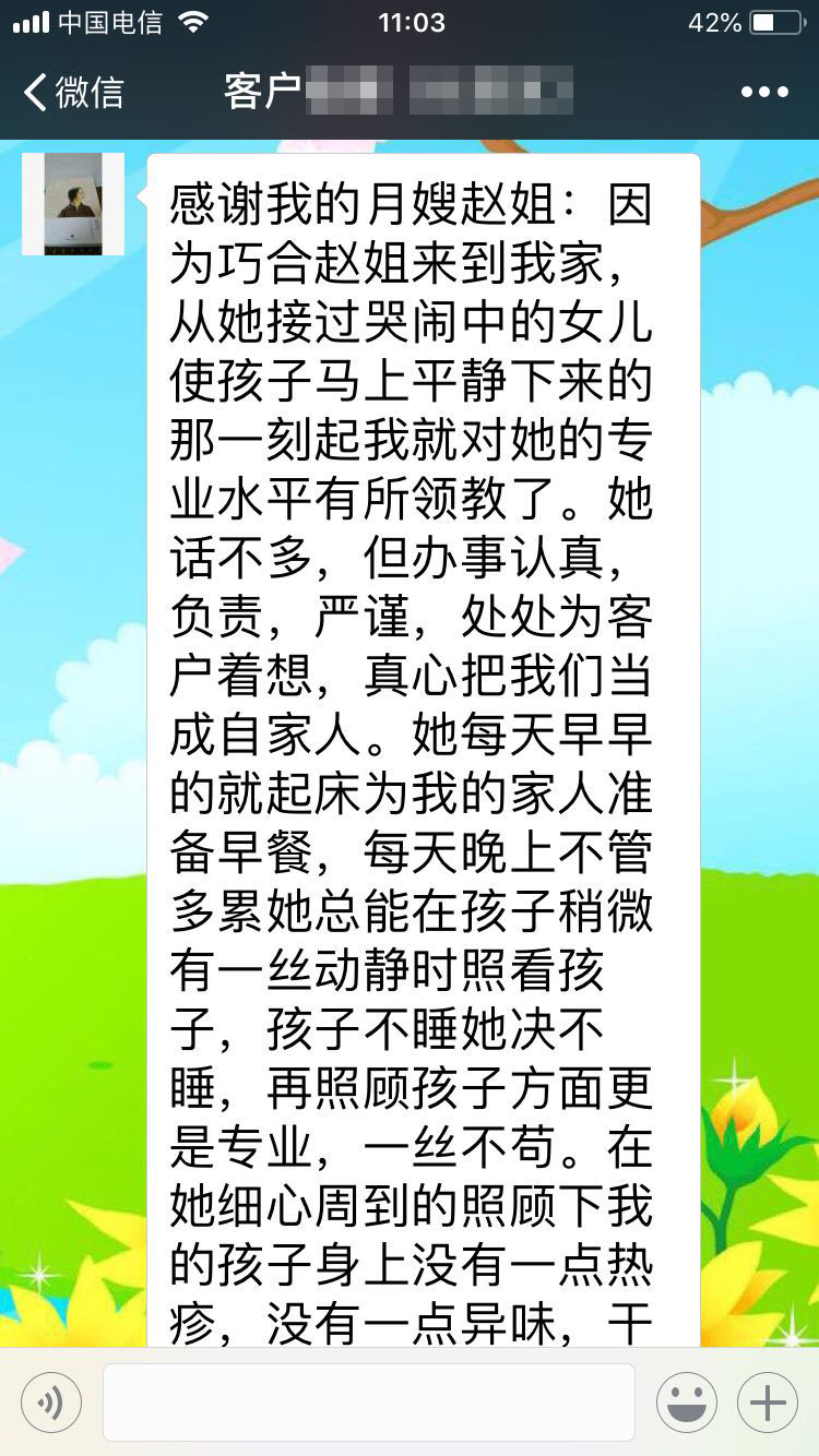 感謝我的月嫂趙姐:因為巧合趙姐來到我家從她接過哭鬧中的女兒使孩子馬上平靜下來的那一刻起我就對她的專業水平有所領教了。她話不多,但辦事認真,負責,嚴謹,處處為客戶著想,真心把我們當成自家人。她每天早早的就起床為我的家人準備早餐,每天晚上不管多累她總能在孩子稍微有一絲動靜時照看孩子,孩子不睡她決不陲,再照顧孩子方面更是專業,一絲不茍。在她細心周到的照顧下我的孩子身上沒有一點熱疹,沒有一點異味,干干凈凈的,我的親戚朋友都夸我的孩子養的好。在我的飲食方面總是變著花樣的給我做好吃的,自從她來后我們家就沒有再買過饅頭,都是她給我們蒸,什么煎餅,烙餅,蔥花餅,菜各…….總之為了讓我多吃一點真是很用心,每次吃飯也是讓我趁熱吃,怕涼了對腸胃不好,每天陪我聊天怕我心情不好回影響我哺乳。26天很快就結束了,我們一家人早已經不把她當成月嫂而是自己人,這不,馬上出戶了,她擔心我一個人看孩子不方便還在祝福我該注意什么,要準備什么,我雖然是二胎但從她身上我學到好多東西。很舍不得趙姐離開,真心感謝她為我們一家所做的一切,也祝賀你們中心能培養出這么優秀的月嫂。祝趙姐身體健康,永遠年輕!也祝你們中心多多培養優秀人才,為大家服務!