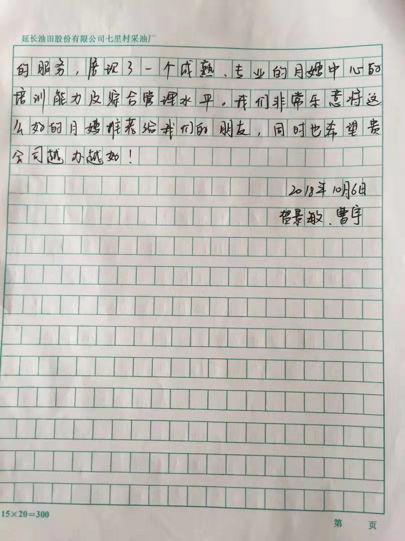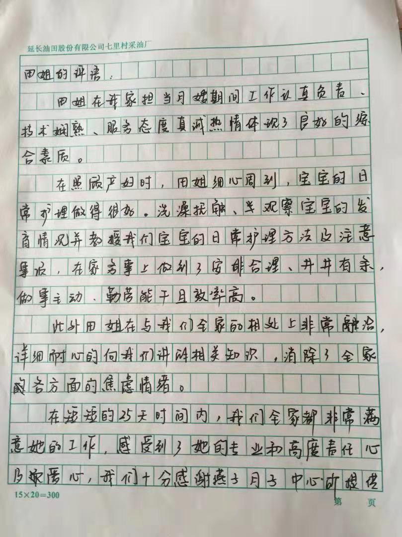 田姐在我家擔當月嫂期間工作認真負責、技術嫻熟、服務態度真誠熱情,體現了良好的綜合素質。
