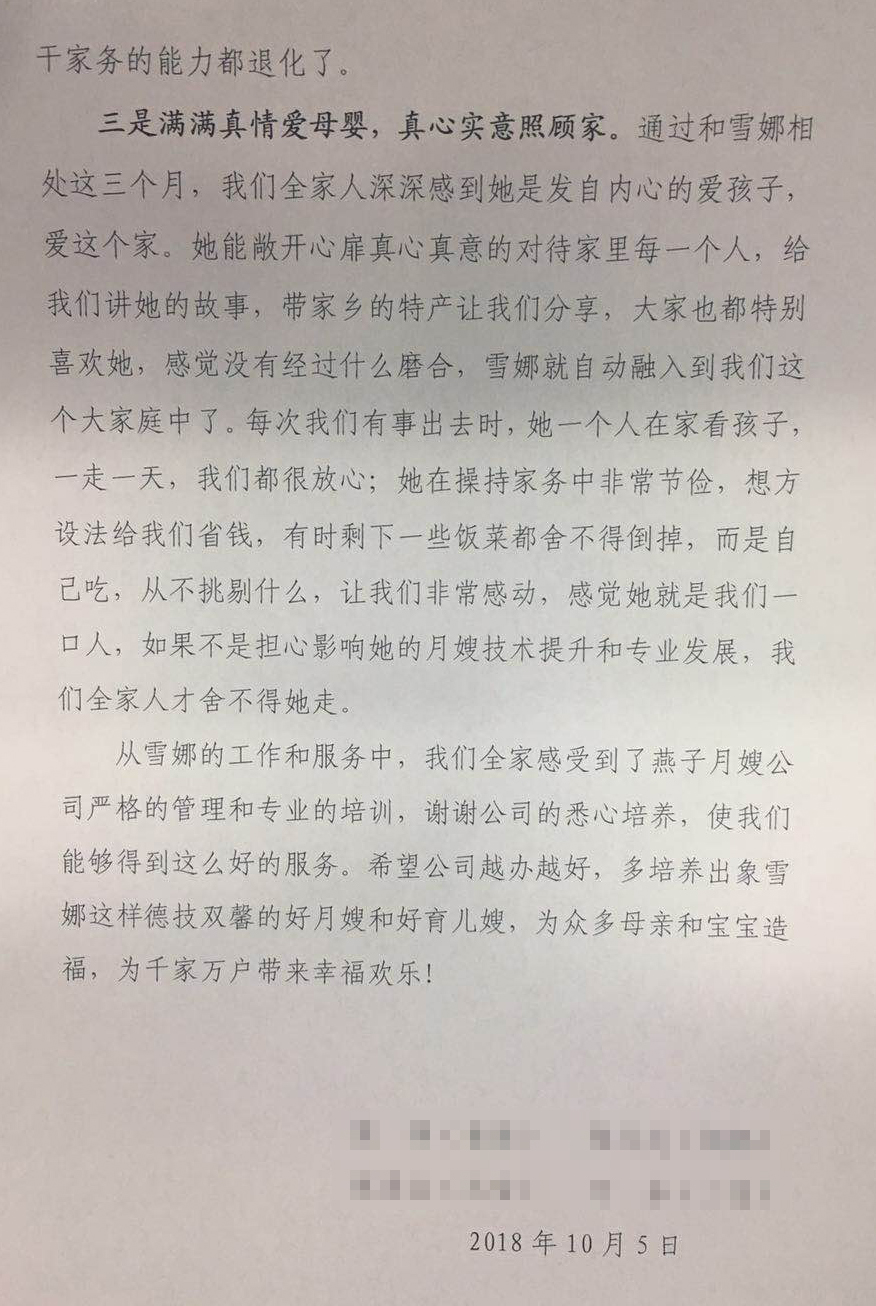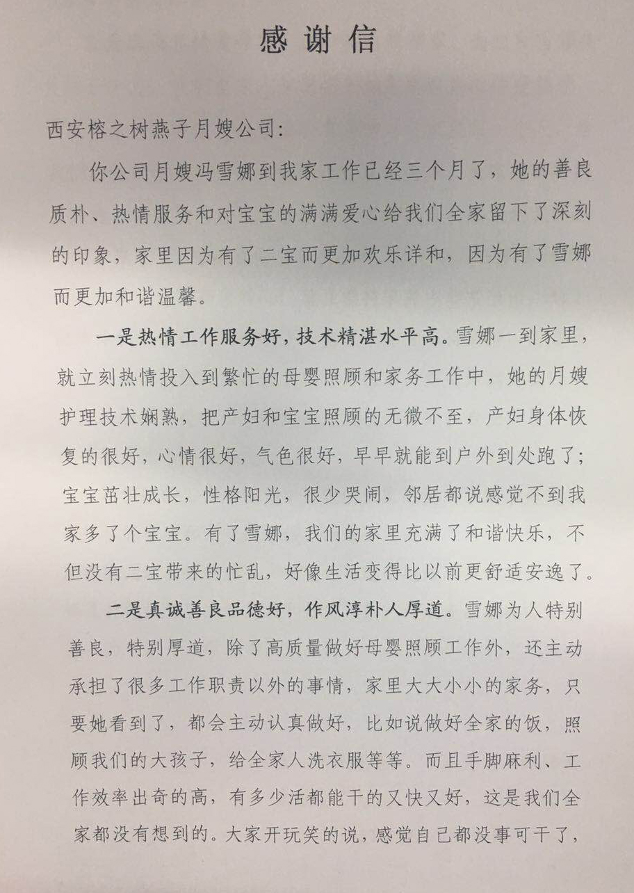 你公司月嫂馮雪娜到我家工作已經三個月了,她的善良 質樸、熱情服務和對寶寶的滿滿愛心給我們全家留下了深刻 的印象,家里因為有了二寶而更加歡樂詳和,因為有了雪娜 而更加和諧溫馨。
