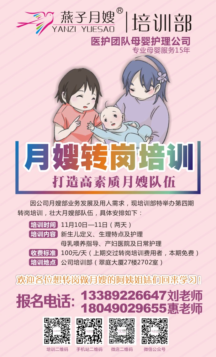 因公司月嫂部業務發展及用人需求,現培訓部特舉辦第四期轉崗培訓,壯大月嫂部隊伍,具體安排如下: