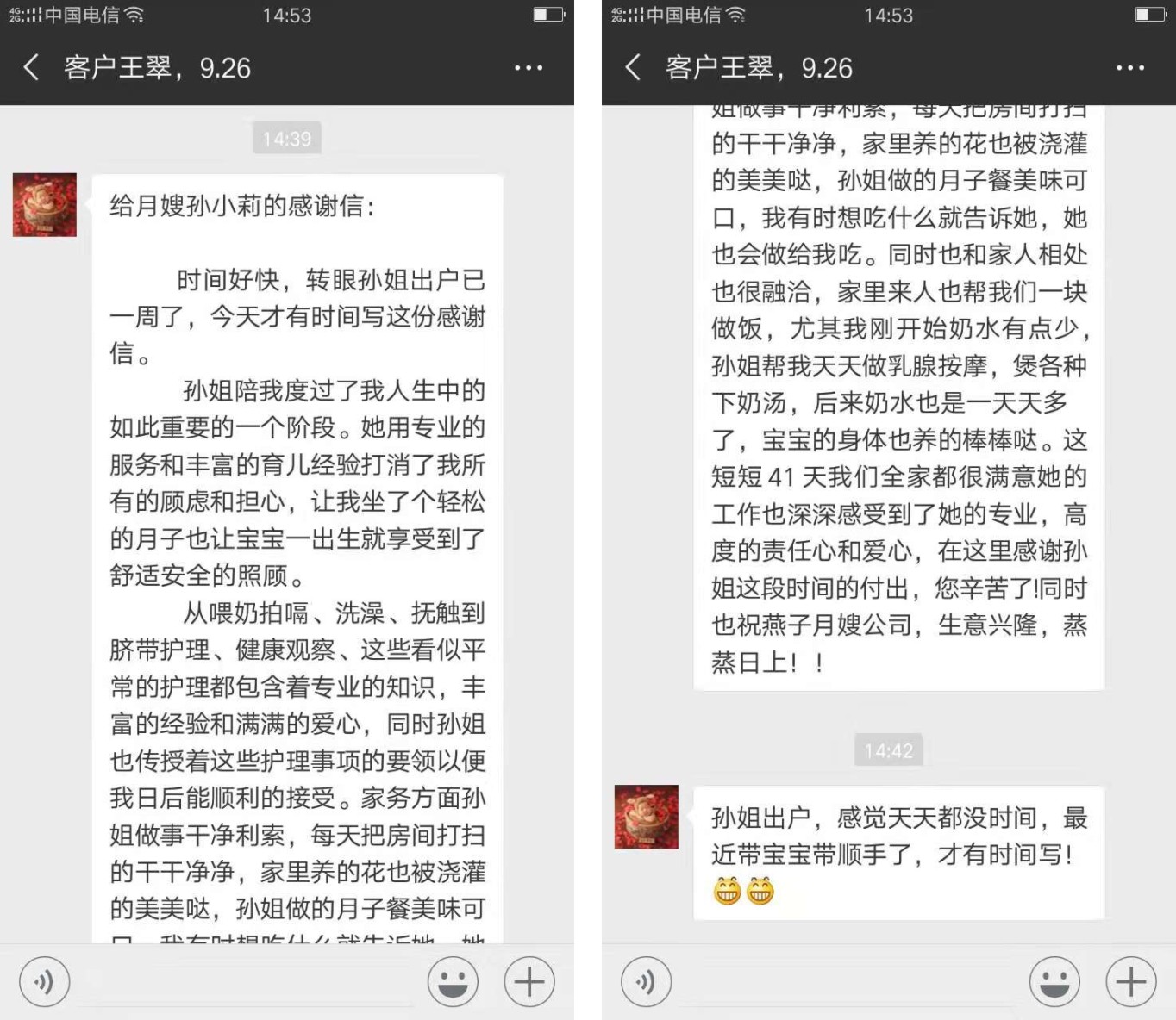 從喂奶拍嗝、洗澡、撫觸到臍帶護理、健康觀察、這些看似平常的護理都包含著專業的知識,豐富的經驗和滿滿的愛心,同時孫姐也傳授著這些護理事項的要領以便我日后能順利的接受。家務方面孫姐做事干凈利索,每天把房間打掃的干干凈凈,家里養的花也被澆灌的美美噠,孫姐做的月子餐美味可口,我有時想吃什么就告訴她,她也會做給我吃。同時也和家人相處也很融洽,家里來人也幫我們一塊做飯,尤其我剛開始奶水有點少,孫姐幫我天天做乳腺按摩,煲各種下奶湯,后來奶水也是一天天多了,寶寶的身體也養的棒棒噠。這短短41天我們全家都很滿意她的工作也深深感受到了她的專業,高度的責任心和愛心,在這里感謝孫姐這段時間的付出,您辛苦了!同時也祝燕子月嫂公司,生意興隆,蒸蒸日上??!