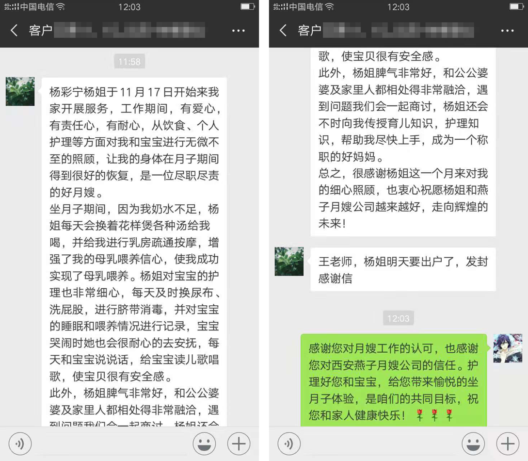 總之,很感謝楊姐這一個(gè)月來對我的細(xì)心照顧,也衷心祝愿楊姐和燕子月嫂公司越來越好,走向輝煌的未來!