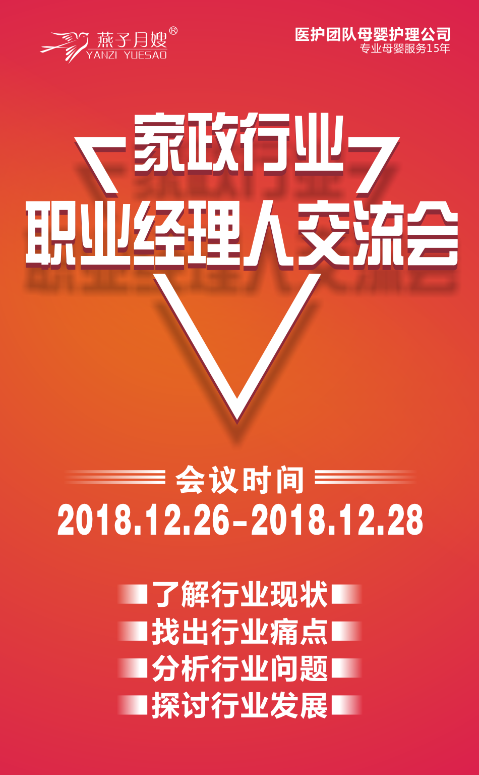 為了加深行業交流,提升行業服務質量,燕子月嫂攜手西安家庭服務業協會將于本月26-28號舉辦一期家政職業經理人交流會。建議參會對象:陜西省各地、市、縣家政企業老板及家庭服務行業培訓老師。