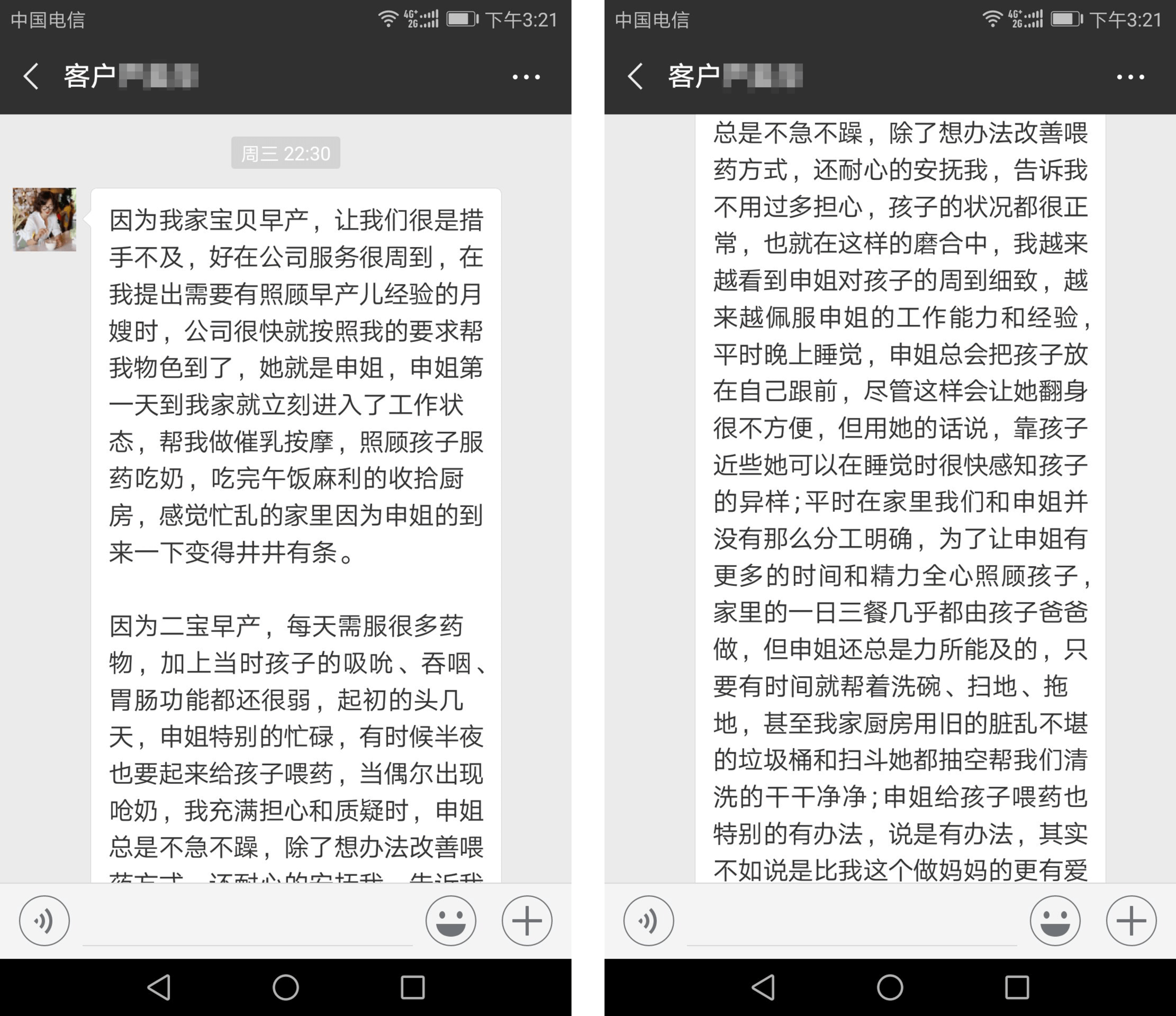 因?yàn)槲壹覍氊愒绠a(chǎn),讓我們很是措手不及,好在公司服務(wù)很周到,在我提出需要有照顧早產(chǎn)兒經(jīng)驗(yàn)的月嫂時(shí),公司很快就按照我的要求幫我物色到了,她就是申姐,申姐第一天到我家就立刻進(jìn)入了工作狀態(tài),幫我做催乳按摩,照顧孩子服藥吃奶,吃完午飯麻利的收拾廚房,感覺(jué)忙亂的家里因?yàn)樯杲愕牡絹?lái)一下變得井井有條。