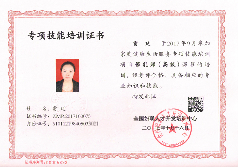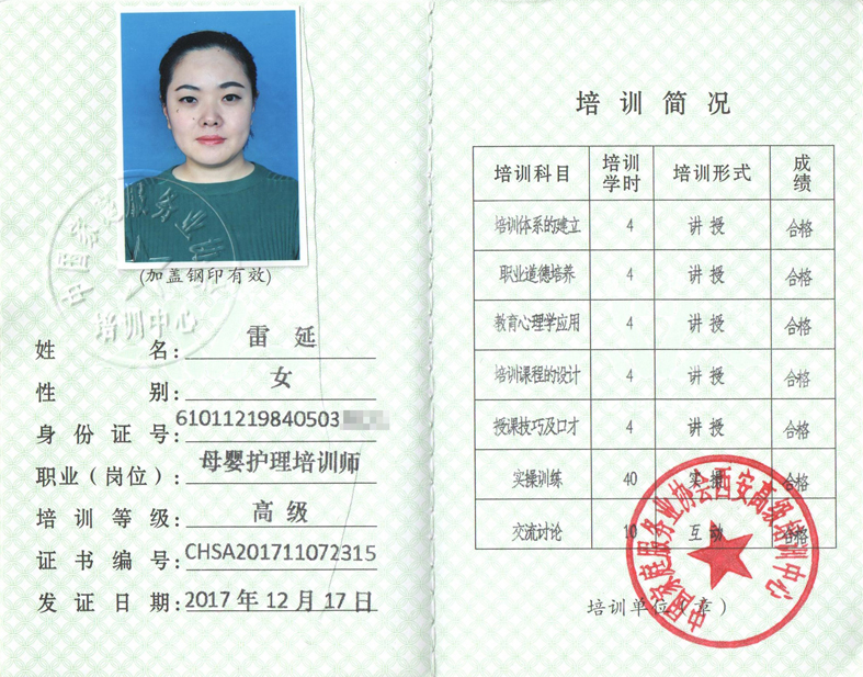 財會專業大專畢業,畢業后在電信公司從事客服工作,2014年進入燕子月嫂公司從事月嫂技術指導工作。工作期間受公司委派到北京學習嬰幼兒測評,并獲得相關證書,同年獲得高級母嬰護理師講師證、高級催乳師證。2015-2017年遠赴延安市、武功縣、藍田縣等多地參與母嬰護理培訓。現任公司月嫂部經理,高級母嬰護理師、高級育嬰師培訓高級講師。