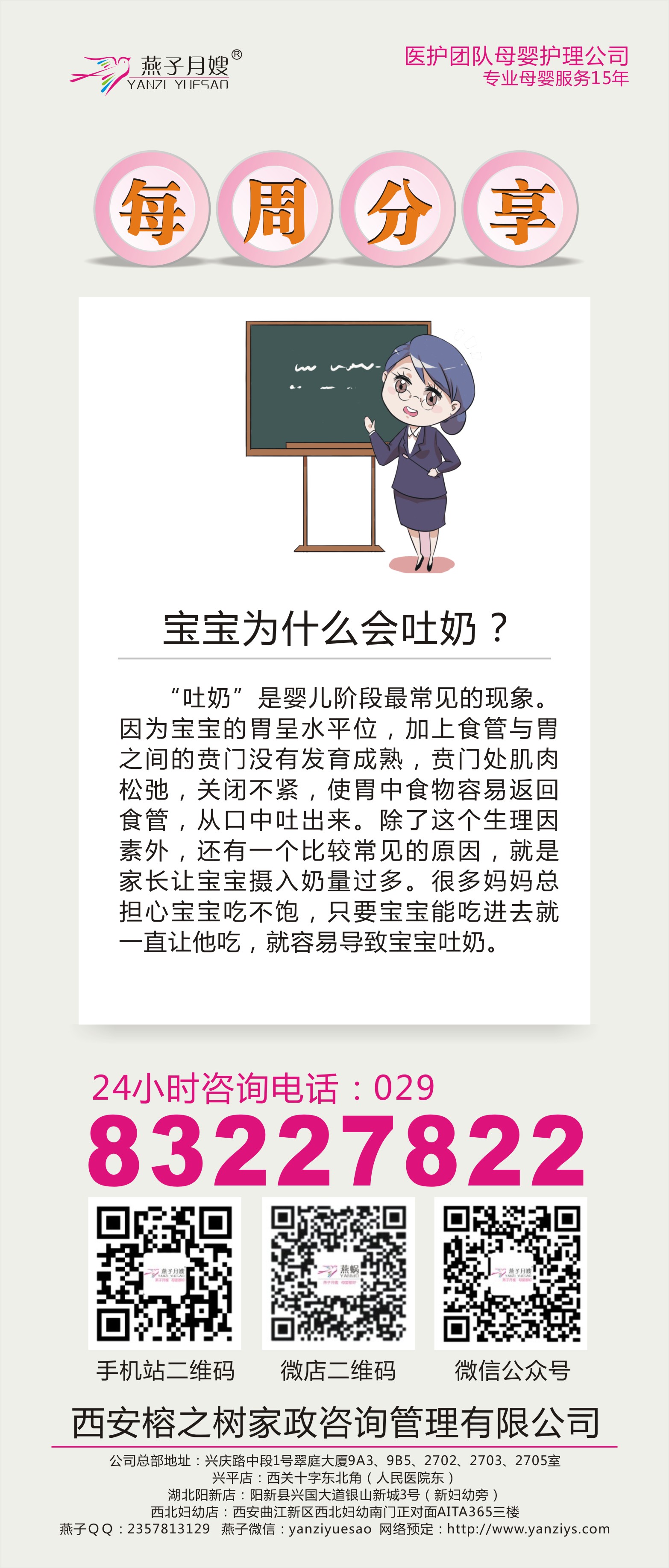 公司總部地址:西安市興慶路中段1號翠庭大廈27層 聯系電話:029-83227822 興平分公司:興平市西城街道西豐3巷47號二樓 聯系電話:15686123167 咨詢電話:029-83227822 18092548539 18089234107 小程序商城:西安育嬰師 微信:yanziyuesao 網絡預定:www.3eart.cn 備案號:陜ICP備17016986號-1