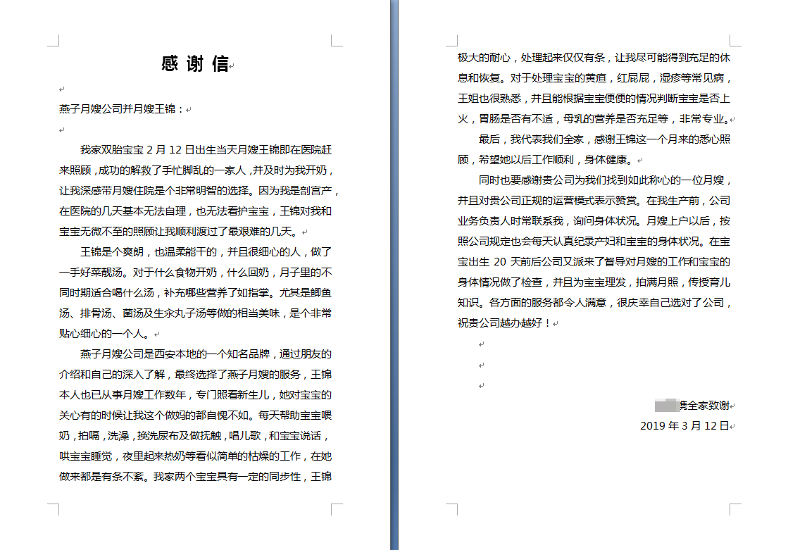 最后,我代表我們全家,感謝王錦這一個月來的悉心照顧,希望她以后工作順利,身體健康。