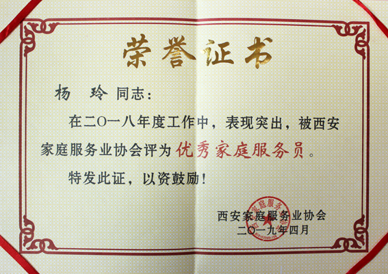 楊玲榮獲“2018年度優秀家庭服務員”稱號
