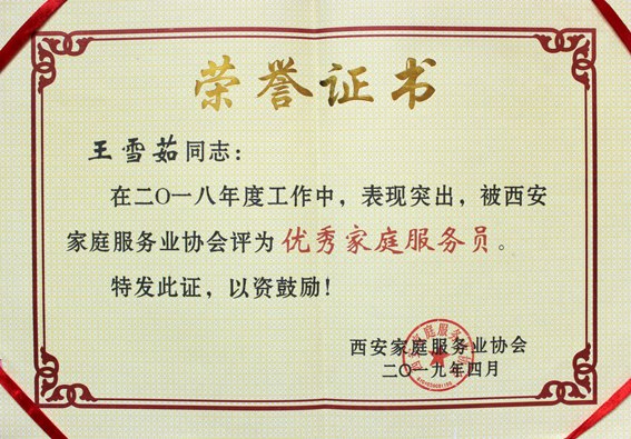恭喜王雪茹榮獲“優(yōu)秀家庭服務(wù)員”稱號