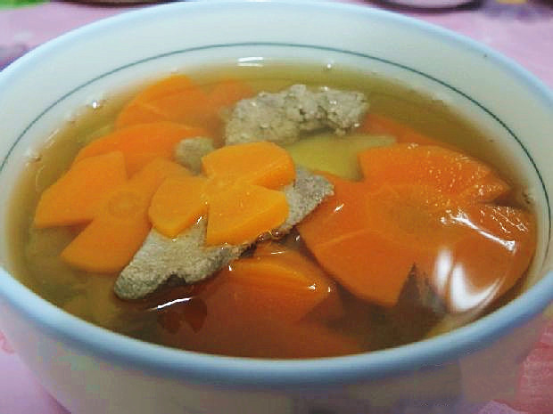 4、沸水放入紅蘿卜,用小火煲十五分鐘,再放豬肝、姜片煮至熟,加鹽調味即可食用。